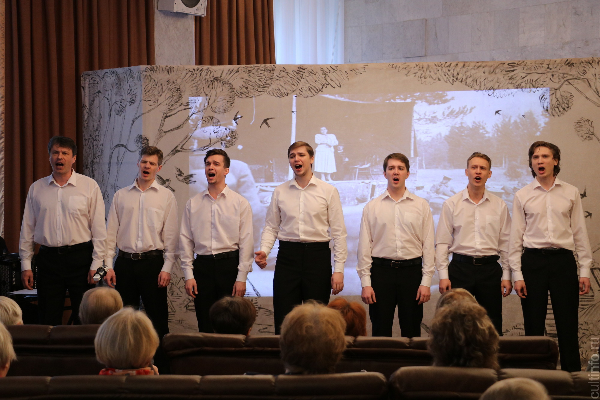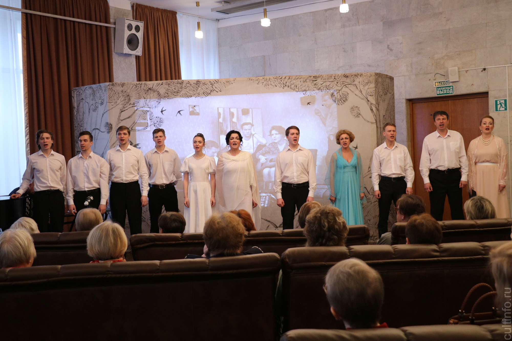 В камерной обстановке фойе второго этажа театра звучали любимые не одним поколением песни из самых трогательных советских фильмов о Великой Отечественной войне: «Небесный тихоход», «Освобождение», «Белорусский вокзал», «Батальоны просят огня» и др. Слушателями концертной программы стали ветераны Вологодского отделения Союза театральных деятелей России и пенсионеры.