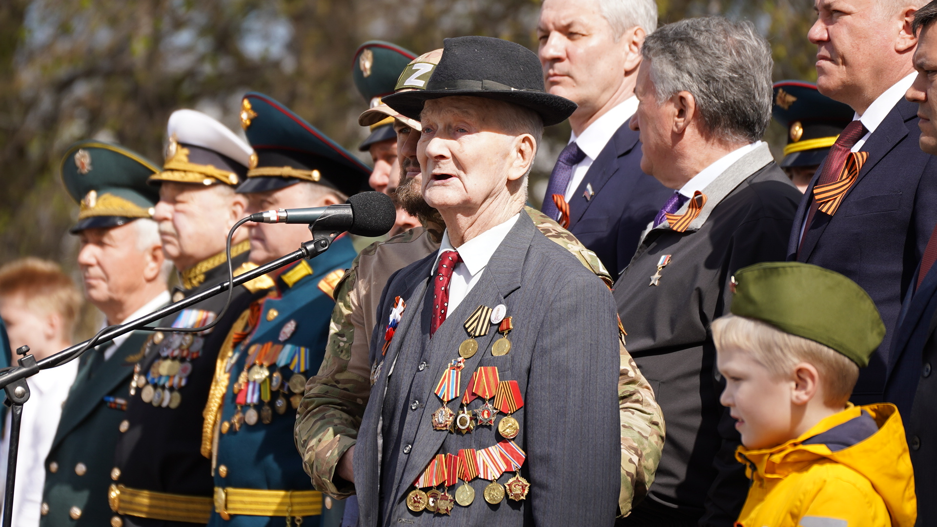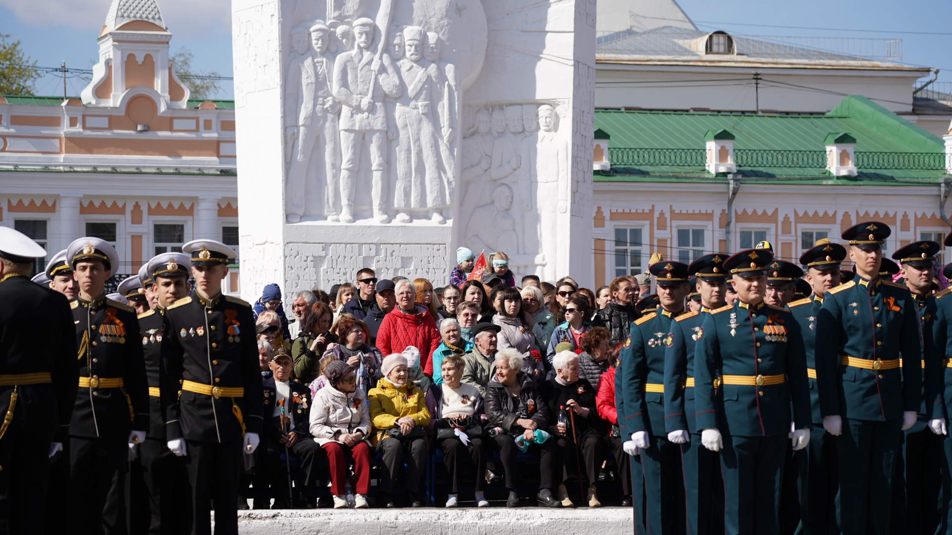 Главными зрителями торжественного марша в честь дня Победы стали ветераны, которые смогли прийти на площадь. За прохождением войск они наблюдали с почетных мест.