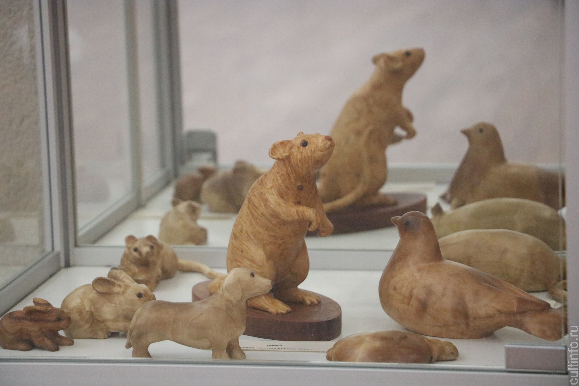 В создании своих работ мастер в первую очередь опирается на природную красоту и традиции. Одна из любимых тематик – анималистические фигуры. Среди работ Андрея Шаварда можно увидеть цаплю, бегемота, крысу, лягушек, белок, собак и многих других животных. А также морских обитателей – крабов, рыб, мурен. В экспозиции представлена одна из любимых и ювелирных работ автора – осьминог, над которым мастер трудился довольно продолжительное время.