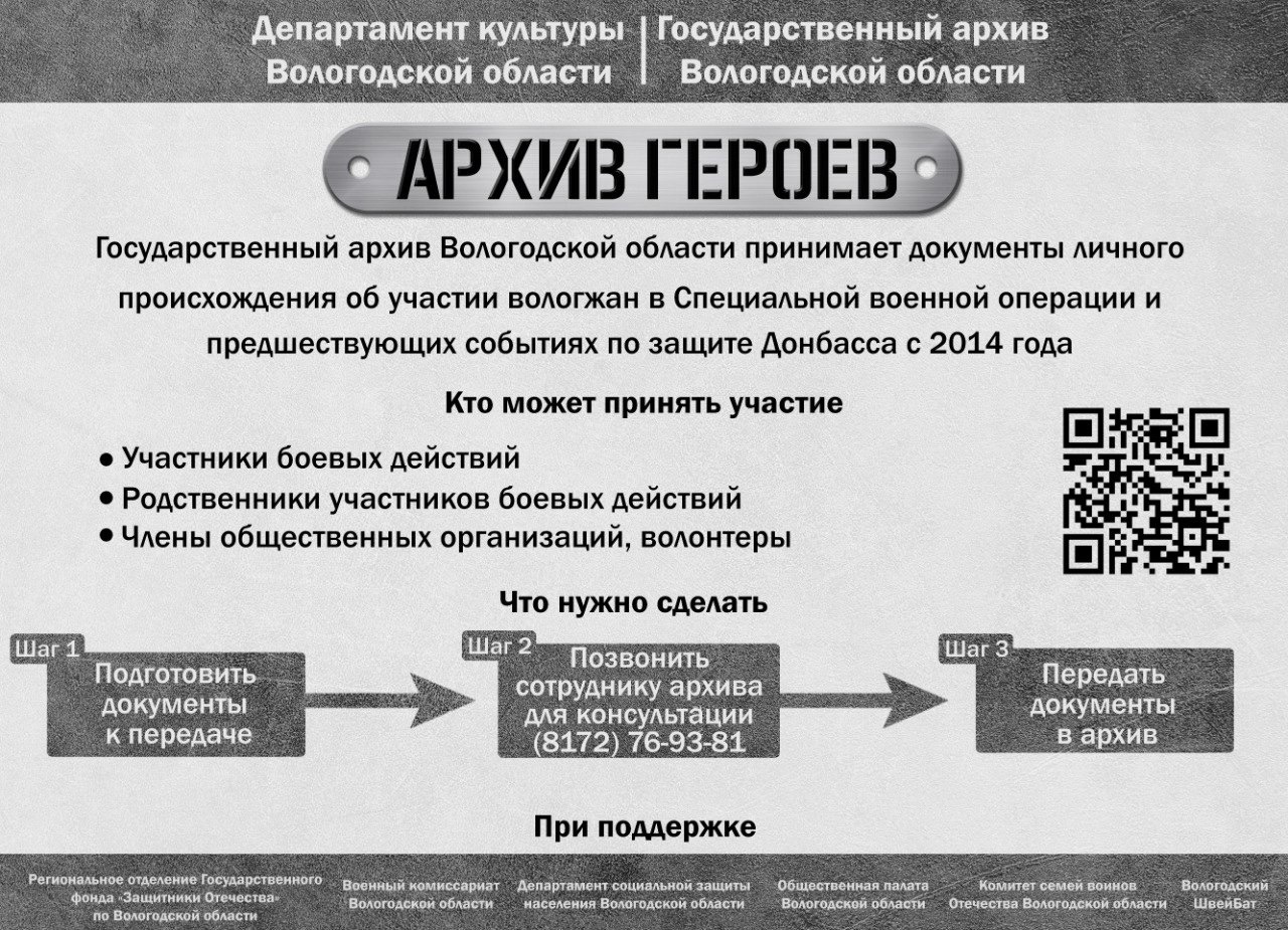 Прием документов в архив возможен на различных носителях, в разнообразных формах: текстовые, изобразительные, аудиовизуальные, электронные. Для потенциальных сдатчиков разработана памятка по передаче документов личного происхождения на постоянное хранение в архив. По вопросам сдачи документов в «Архив Героев» можно связываться с главным архивистом отдела комплектования Госархива Анной Забродиной по телефону 8(8172)76-93-81 или лично по адресу г. Вологда, ул. Мальцева, д.17, каб. 9.