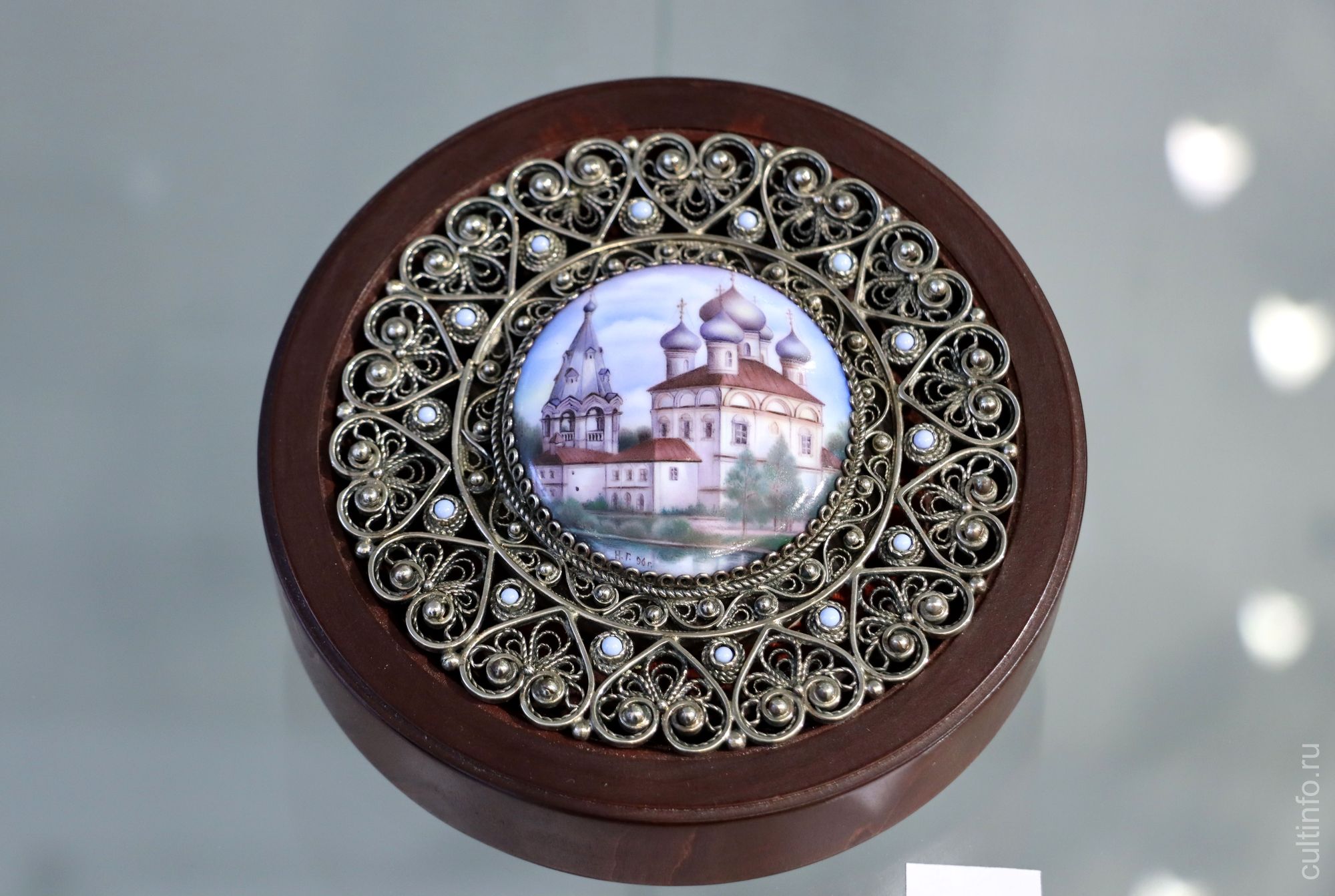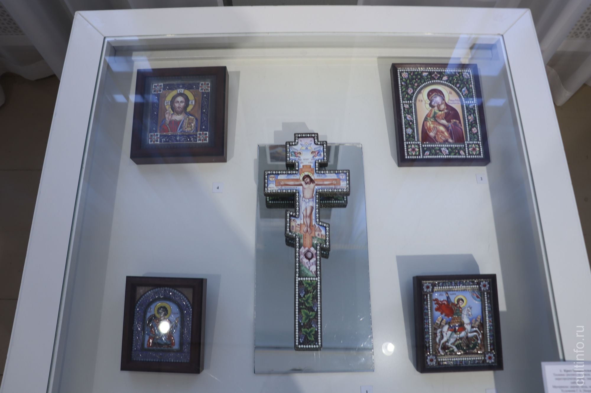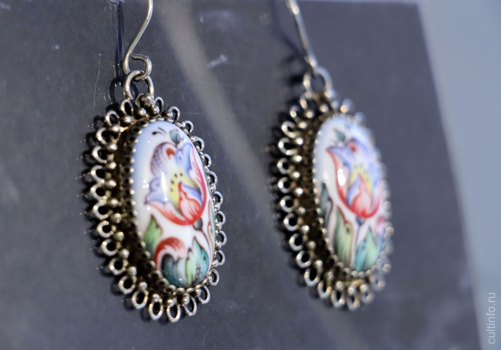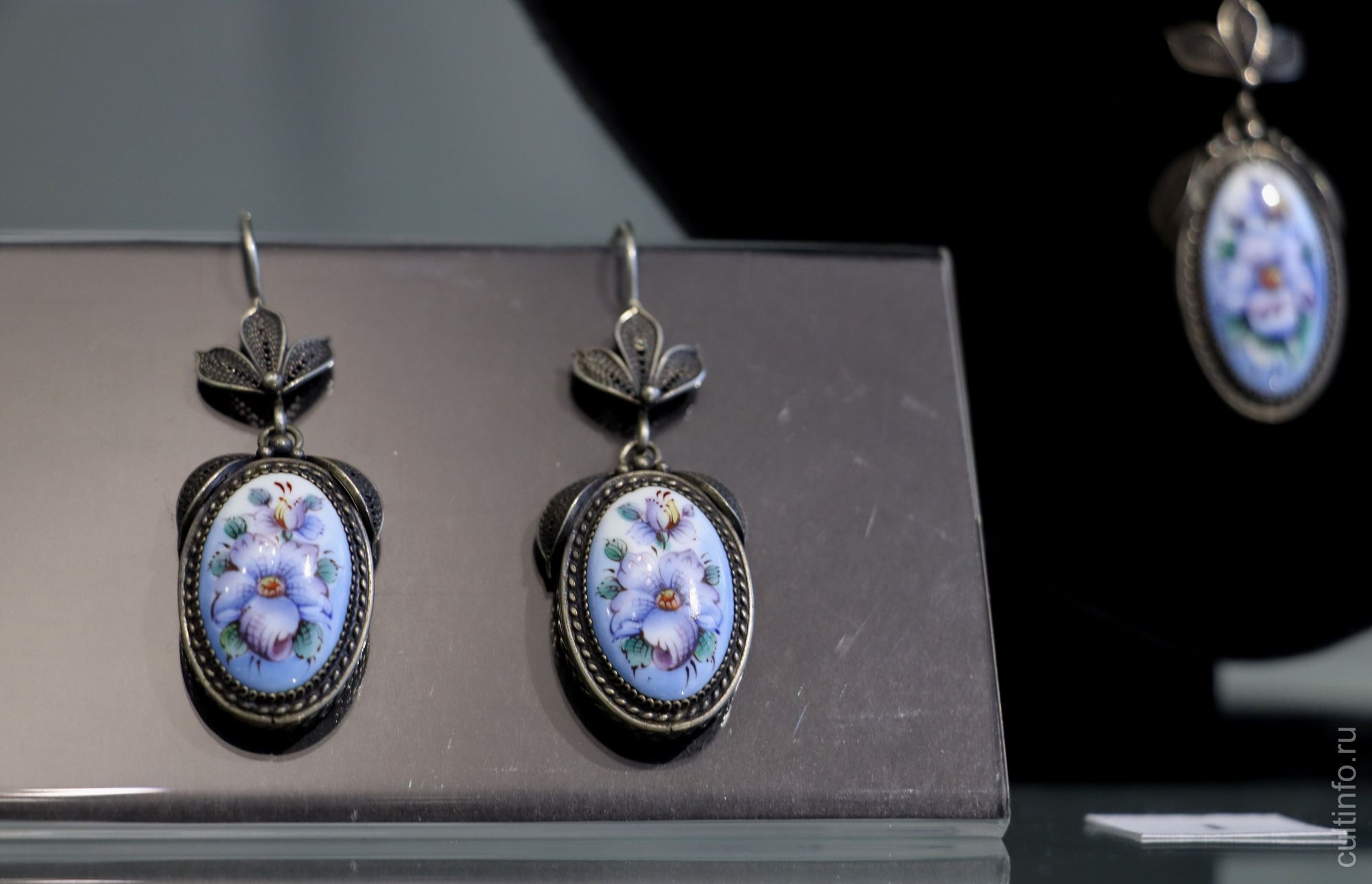 Колье, серьги, медальоны, шкатулки, декоративные тарелки и панно, изделия церковной тематики: лампадки, кресты и иконы святых покровителей – выполнены в различных техниках ювелирного искусства. Это скань, финифть и филигрань, перегородчатая эмаль и роспись по эмали.