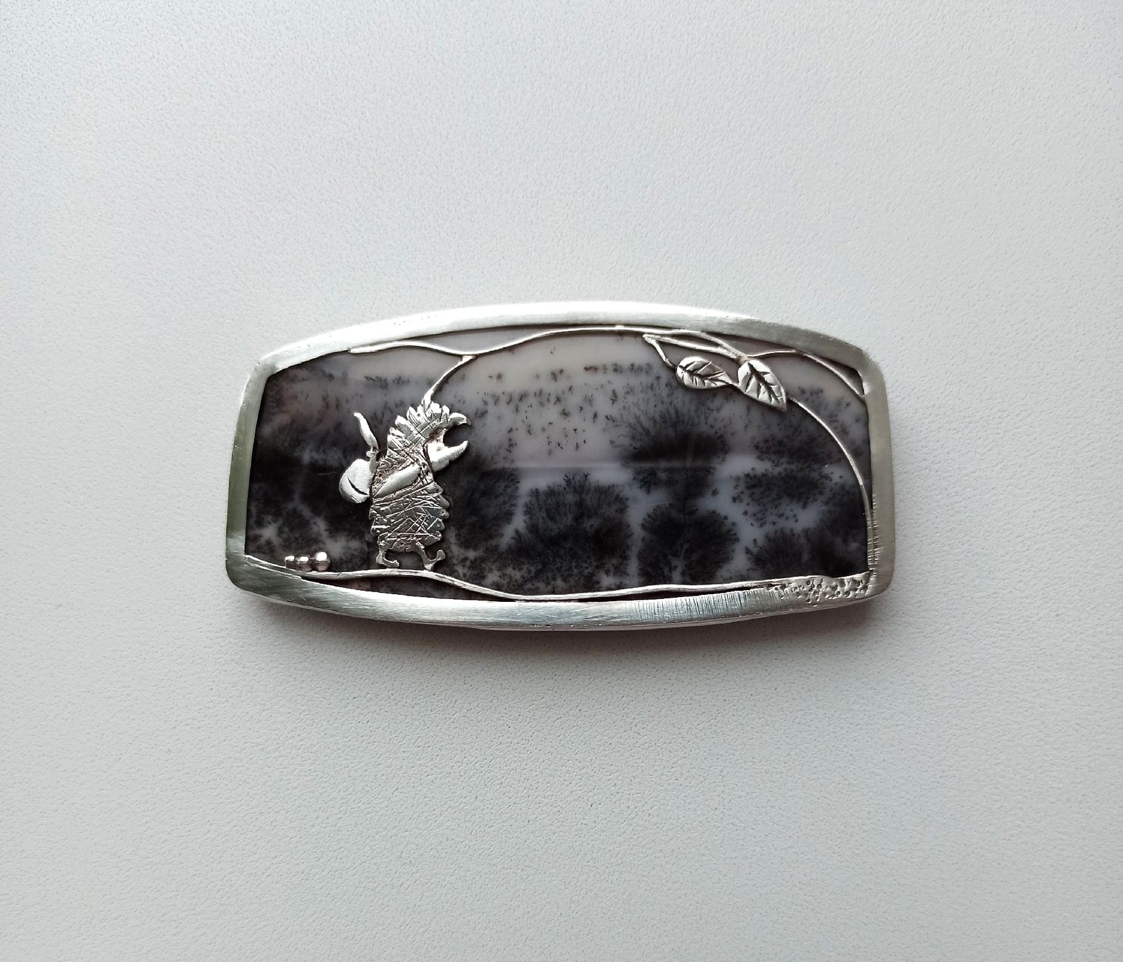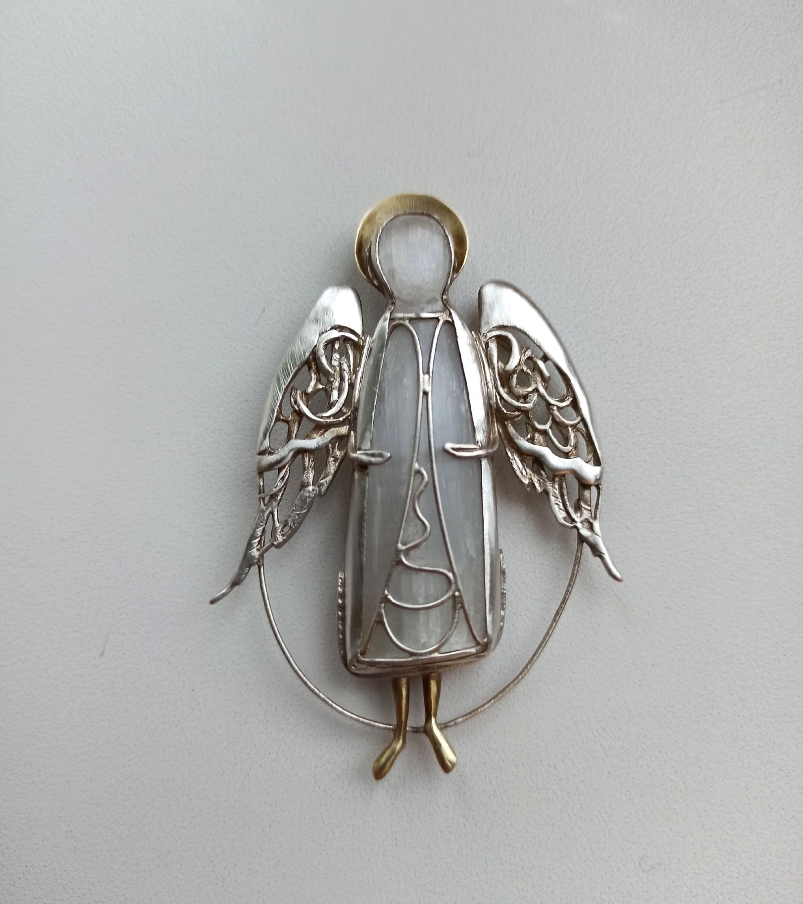 Подвесы, броши, кольца, пояса, шкатулки, колье, ювелирные гарнитуры созданы с использованием бирюзы, агата, аквамарина, цитрина, сердолика, янтаря, хризопраза, малахита, яшмы. Автор также применяет в изделиях такие материалы, как черепаховый панцирь, жемчуг, рог. Мы заглянули в ее мастерскую в преддверии Нового года, поэтому показываем вам изделия на зимнюю и рождественскую тему – это нежные перламутровые ангелы, очаровательные броши «Пингвинчик» и «Ежик в тумане», а еще украшения, олицетворяющие саму зиму. Это колье с россыпью изящных жемчужинок, напоминающих аккуратные комочки снега, брошь с застывшим озером в льдистых оковах, серьги-сердца с камнями цвета яркого зимнего неба и многие другие украшения. Любуйтесь и вы ювелирной красотой!