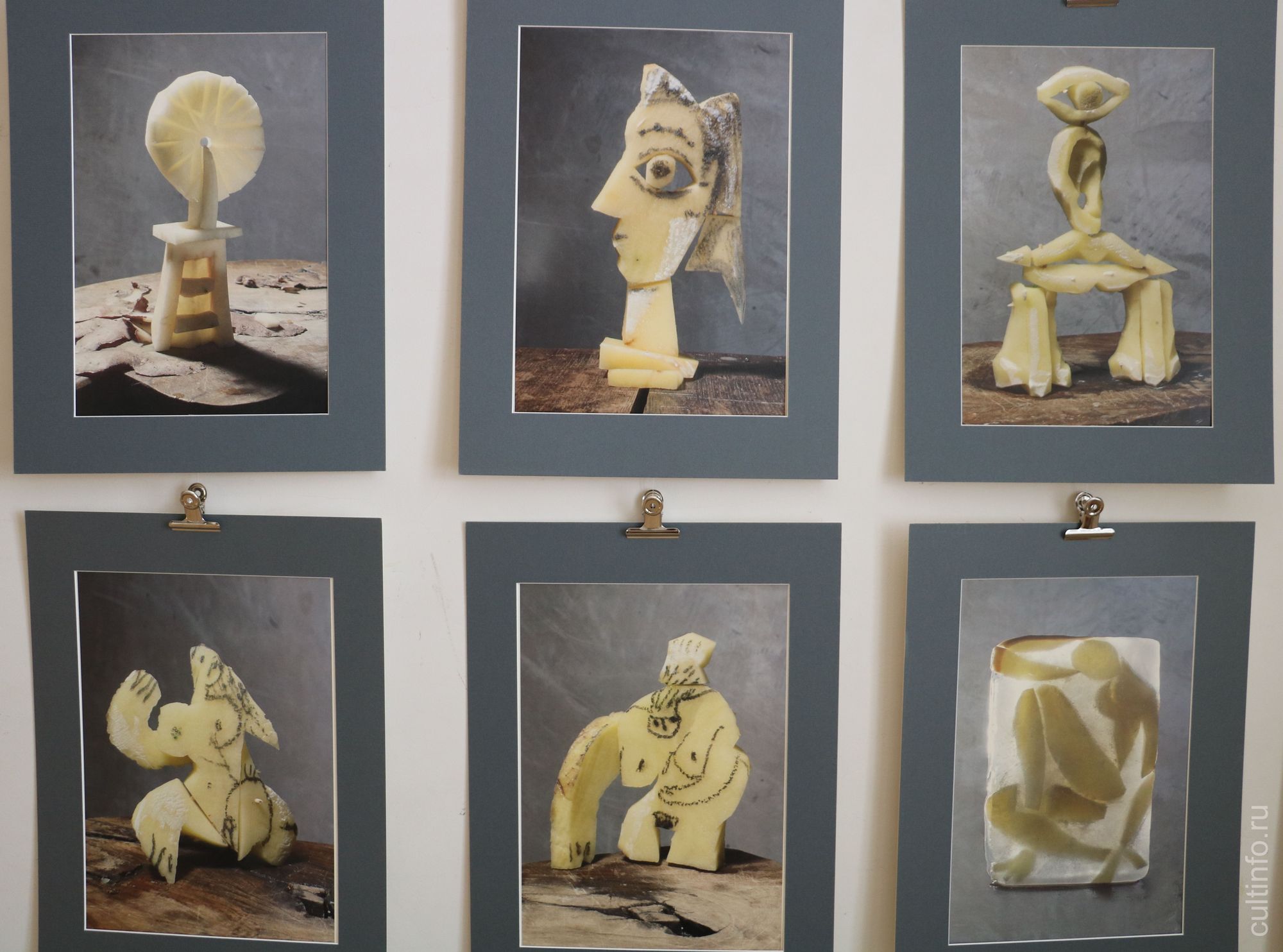 Совершенно удивительными и чудными предстают перед зрителем скульптуры из картофеля, хотя бы потому, что не каждый из нас предпринимал попытки создавать из корнеплода и его кожуры изысканные изваяния. Вернемся на несколько лет назад: в стране – локдаун, все сидят дома. Казалось бы, какое творчество в четырех стенах? Именно тогда Денис Трусевич начал создавать скульптуры из… картофеля. Поначалу ничего не получалось: автор вырезал элементы ножом, скреплял зубочистками, но все падало и портилось. Постепенно материал стал поддаваться. Источником вдохновения для художника стали репродукции произведений именитых мастеров: «Пьер Арман для своих абстракций распиливал скрипки, а я мастерски поделил картошку на части, поэтому на выставке вы можете увидеть и мою «скрипку». Чтобы изобразить истуканов с острова Пасхи, я вырезал одну фигуру, поставил два зеркала, а в отражении их получилось несколько».