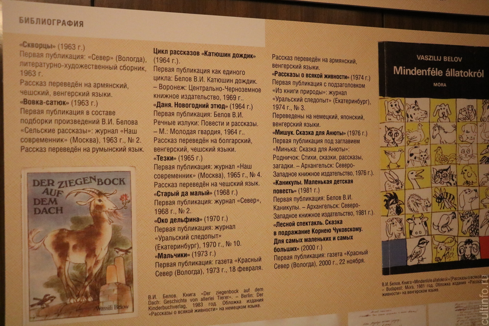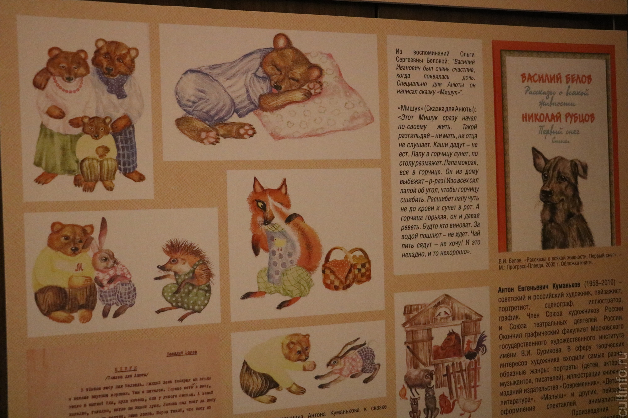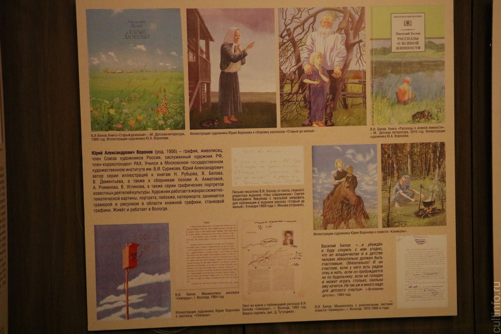 Выставка дополнена информационным материалом о художниках, об истории создания детских произведений. В экспозицию вошли редкие фотографии и документальные материалы из фонда Музея-квартиры В. И. Белова. Здесь есть рукописные и машинописные черновые варианты рассказов, письма от издательств, отклики юных читателей.