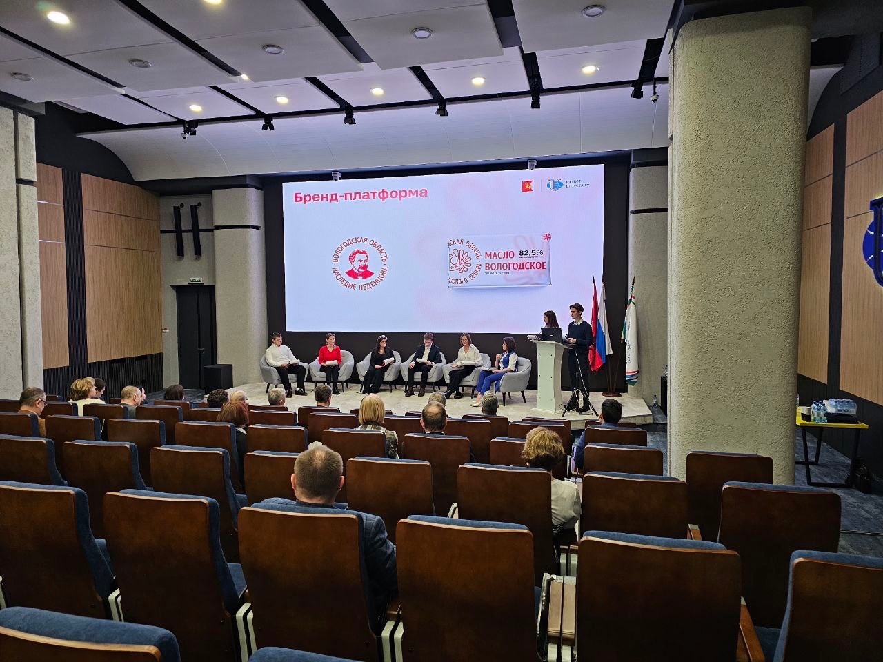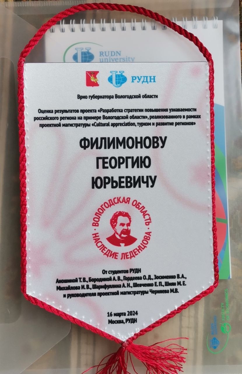 Также магистры подготовили для главы Вологодской области – в прошлом выпускника РУДН, а затем профессора кафедры теории и истории международных отношений – памятный подарок от себя: вымпел с логотипом «Вологодская область. Наследие Леденцова».