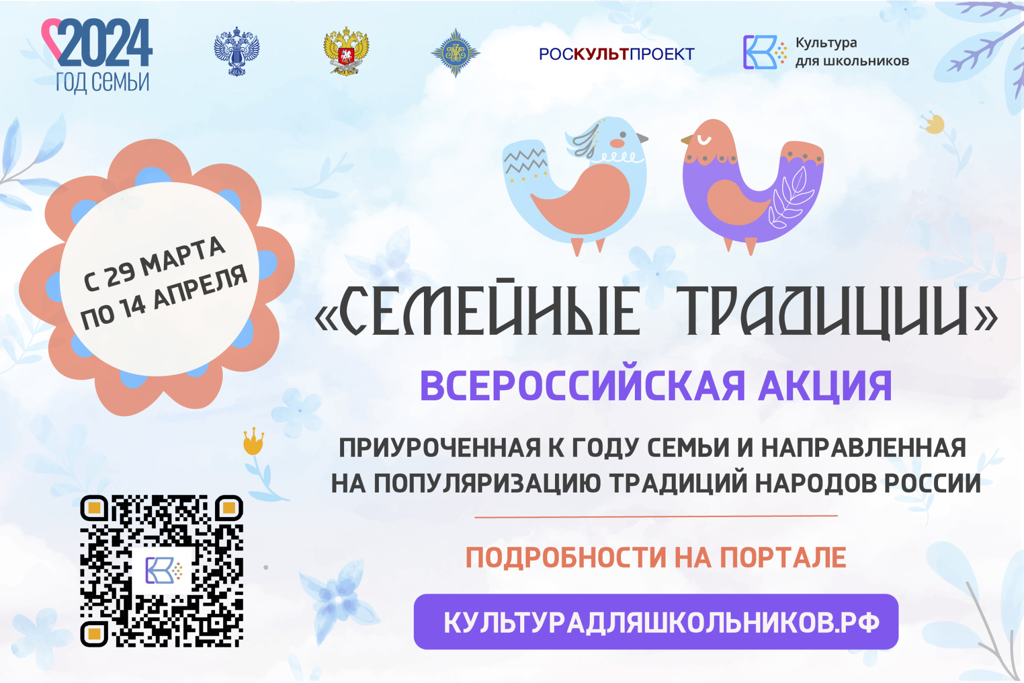 Всероссийская акция «Семейные традиции» пройдет с 29 марта по 14 апреля в рамках межведомственного проекта «Культура для школьников». Акция приурочена к Году семьи и направлена на популяризацию традиций народов России.
