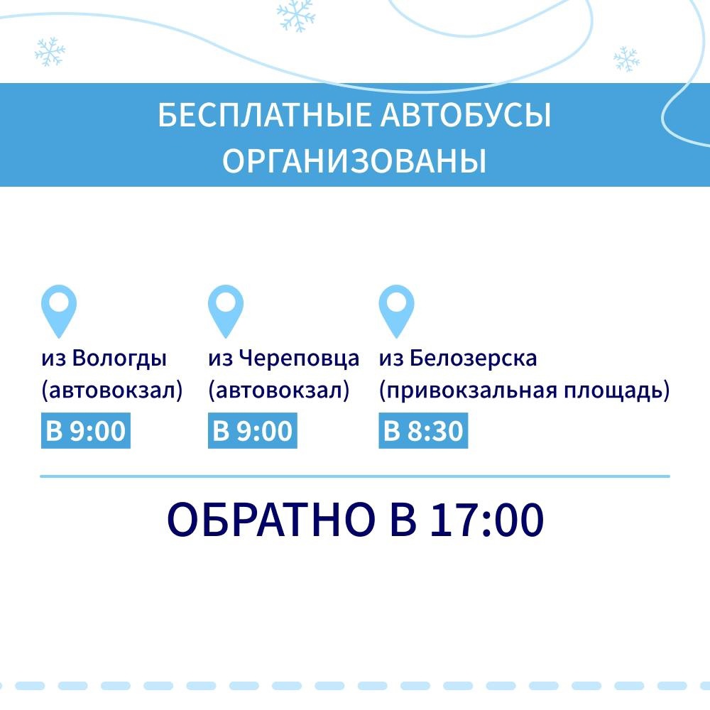 Также будет бесплатный автобус из Белозерска, который отправится в 8:30 от привокзальной площади. Обратный рейс – в 17:00.