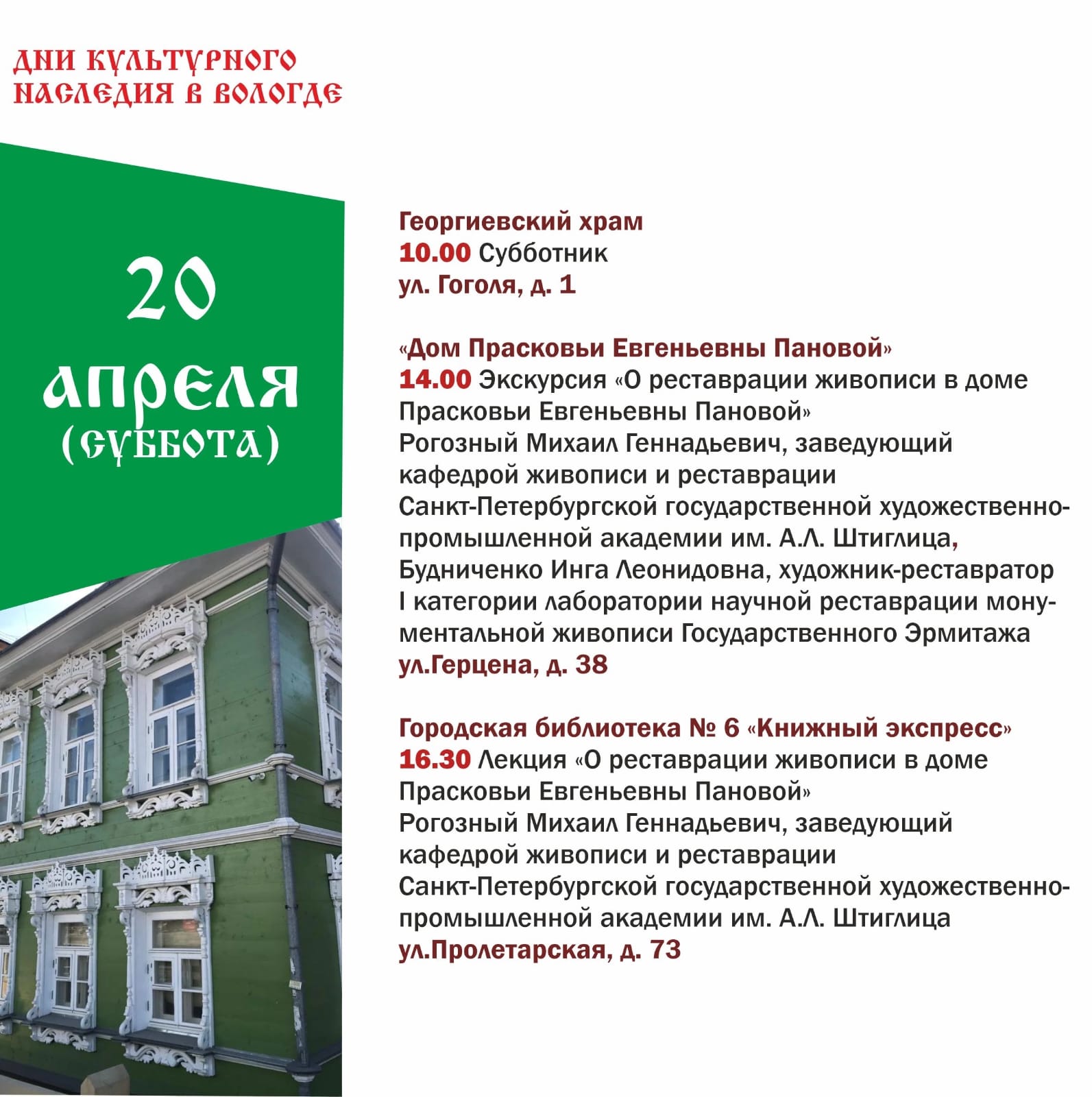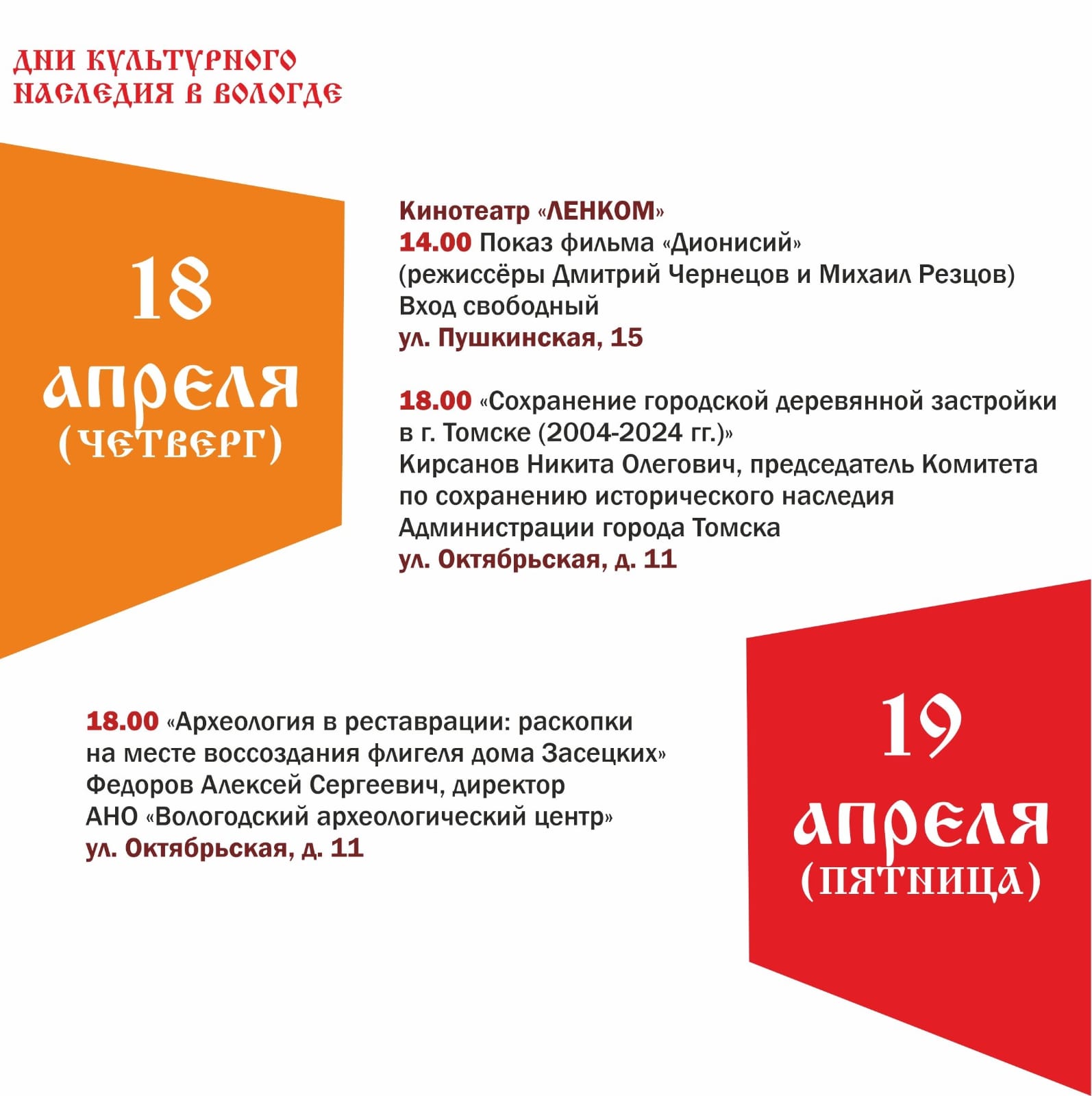 «Дни культурного наследия» пройдут в Вологде 13-21 апреля при поддержке Администрации города. Они приурочены к Международному дню памятников и исторических мест, который отмечается 18 апреля. Будут организованы экскурсии по деревянным памятникам архитектуры, лекции, мастер-классы, просмотр фильмов и др. Количество мест ограничено.