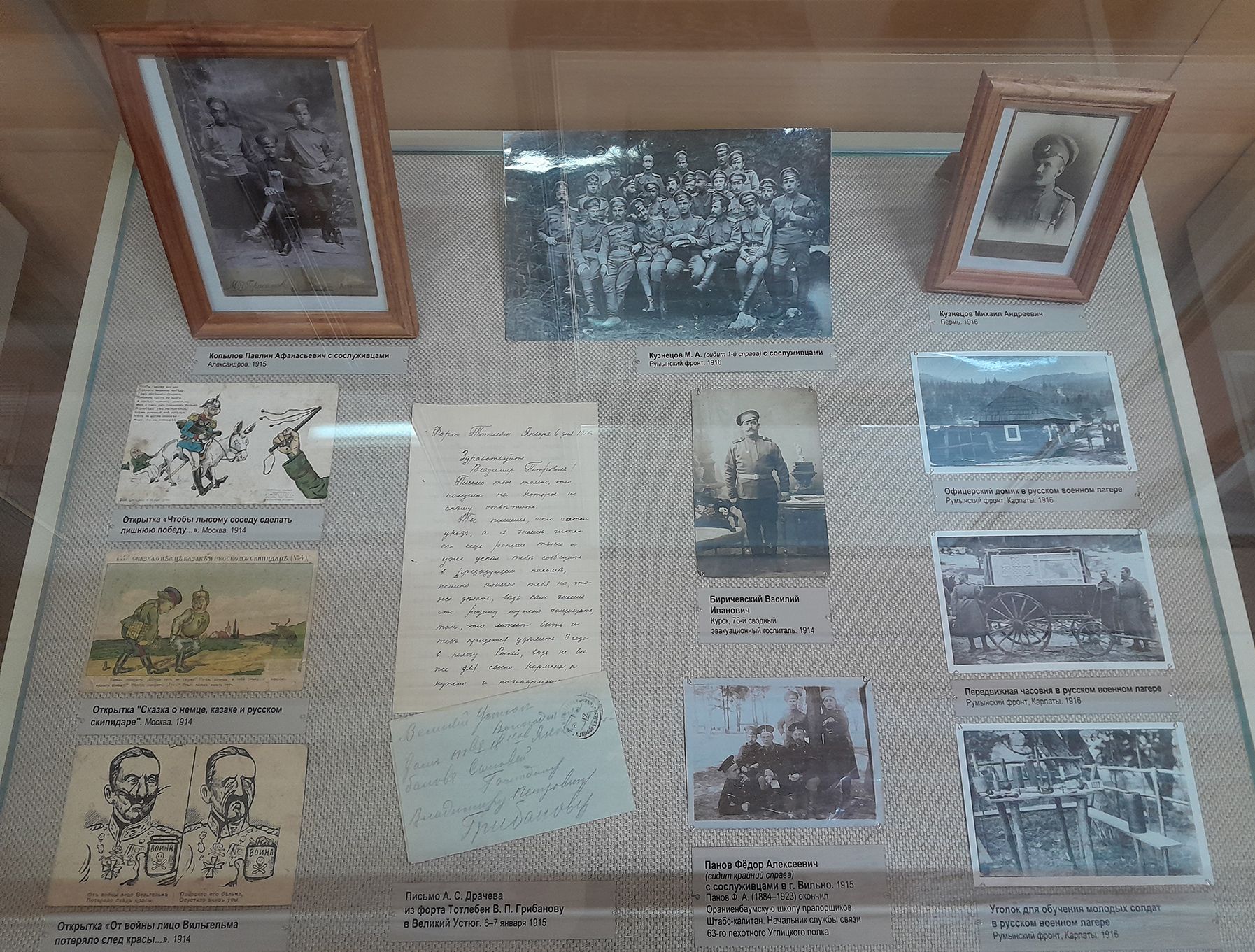 Представлены на выставке фотографии устюжан – участников Первой мировой. На одной из них запечатлен Михаил Кузнецов – выпускник Оренбургской школы прапорщиков. Во время службы в Карпатах он сделал редкие снимки, на которых можно увидеть русский военный лагерь, передвижную часовню, офицерский домик.