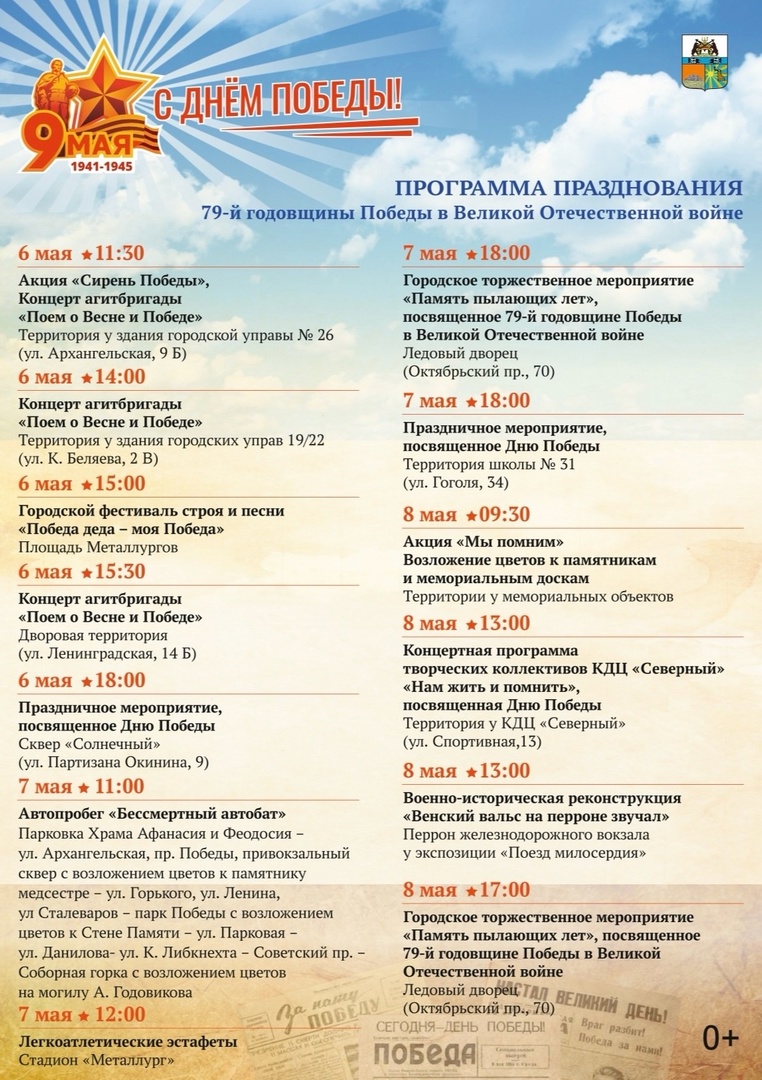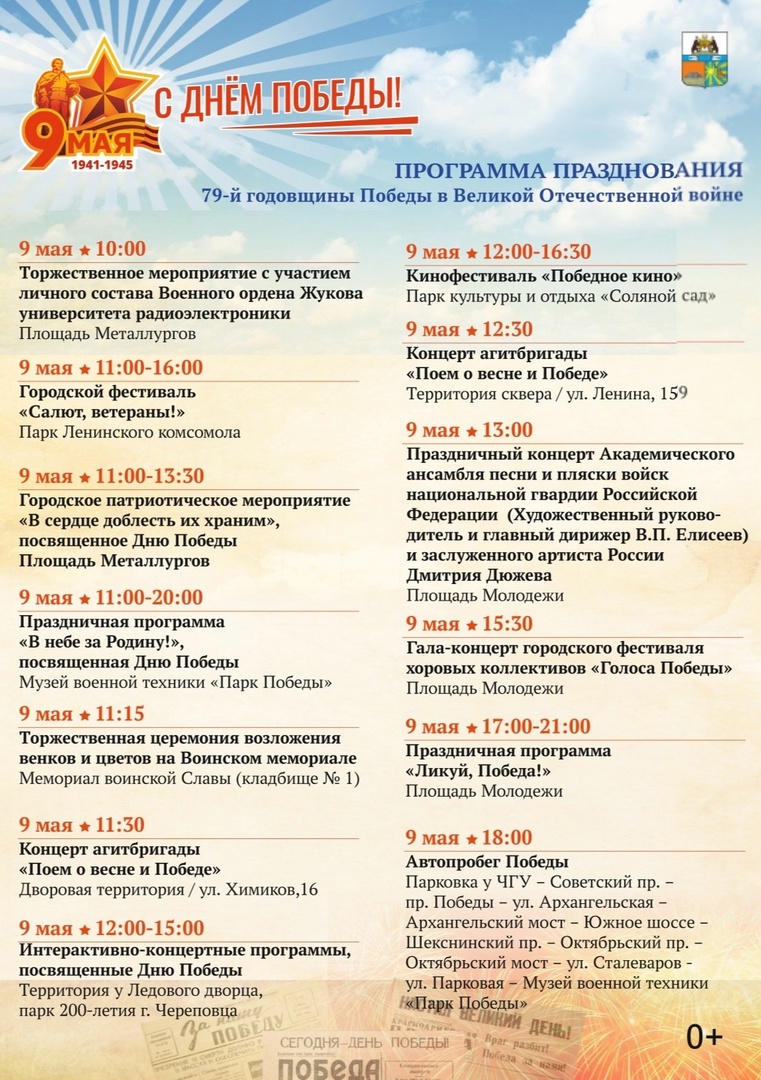 12.00-15.00 – Интерактивно-концертные программы, посвященные Дню Победы. Территория у Ледового дворца, Парк 200-летия Череповца. 6+