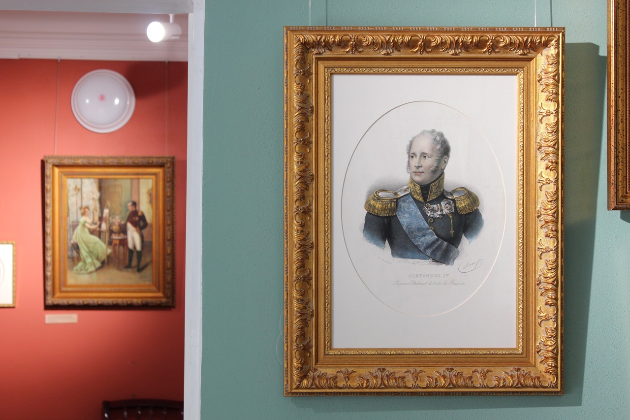 Экспозиция дает возможность сквозь века вглядеться в фигуру незаурядной личности, с кем так упорно не хотела породниться царская семья. Здесь показаны ступени возвышения Бонапарта до статуса первого лица государства, различные сцены жизни и быта, разгром французской армии в России, освободительные походы русской армии в Европу и крах империи Наполеона.