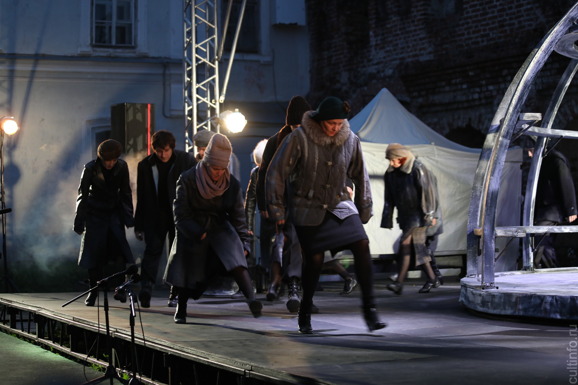 В Консисторском дворе Вологодского кремля состоялся первый показ спектакля, что было особенно волнительно и для артистов, и для постановщиков. Репетировать последние два дня приходилось под дождем, но в день премьеры погода благоволила артистам.