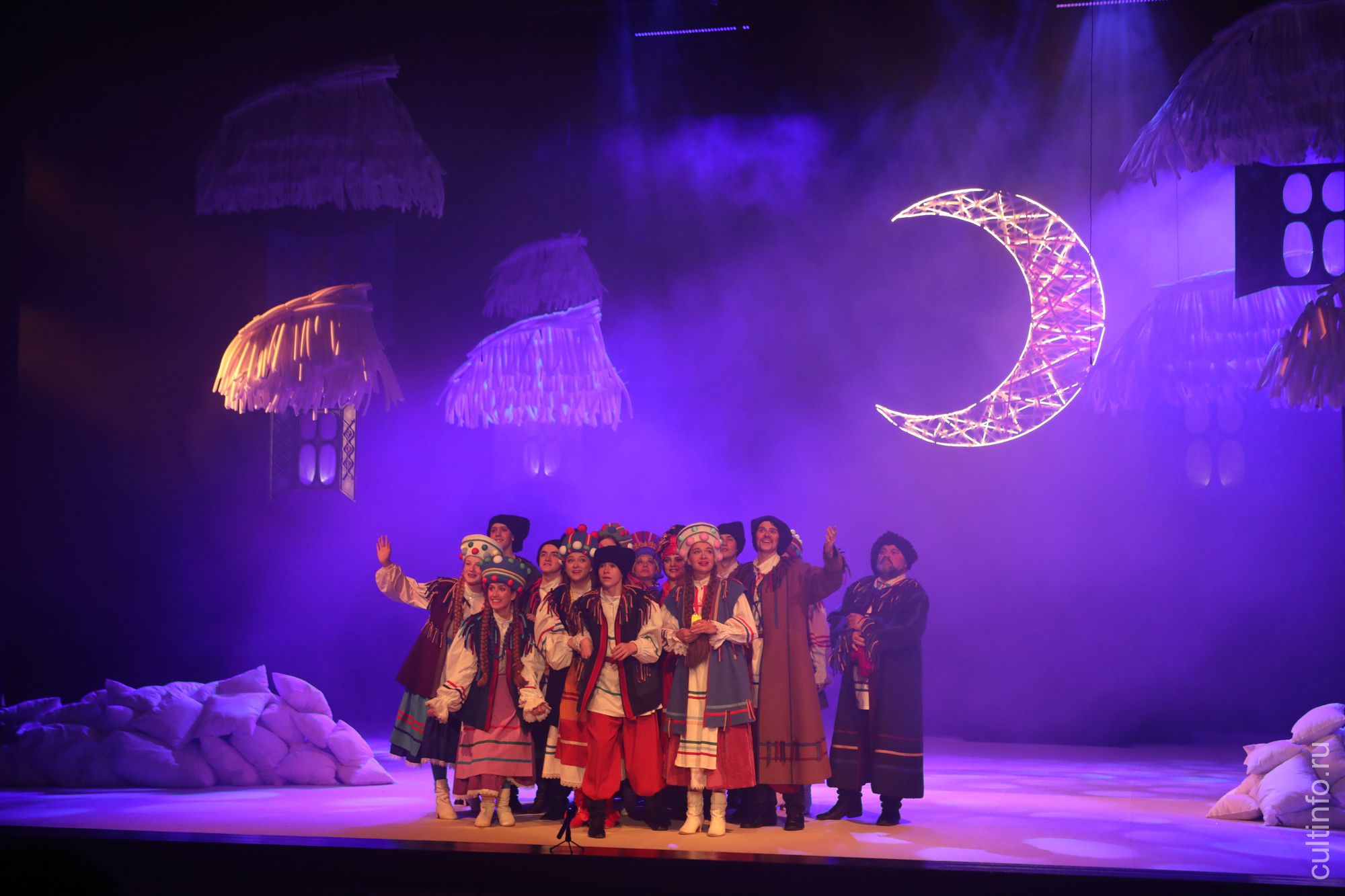 С большим уважением и любовью показаны в спектакле Малороссия, Диканька, веселые дивчины и парубки, православные традиции встречи Рождества. Красочные декорации представляют украинские хатки и плетни, месяц над хутором, который «крадет» ловкий черт. В спектакле много музыки и танцев, массовых сцен гуляний, колядований и игр. Постановка ориентирована в первую очередь на подростков, изучающих произведение в школе – поэтому история, произошедшая под Рождество в одном из украинских хуторов, рассказывается последовательно и обстоятельно. Все герои гоголевской повести предстают перед зрителем такими, какими их описывал автор: красавица Оксана, не устающая кокетливо сомневаться, действительно ли она хороша, влюбленный кузнец Вакула, решающийся ради любви на рискованное путешествие с чертом в Петербург, разбитная Солоха, прячущая в мешки незадачливых гостей, и сами ее гости – черт, голова, дьяк и Чуб; лихие запорожцы, прибывшие на встречу с царицей, сама Екатерина II и ее фаворит граф Потемкин. Интересно и необычно решен образ Пузатого Пацюка, пособника всякой чертовщины, который не предстает в виде человека, а обыгрывается с помощью звуковых и световых эффектов.