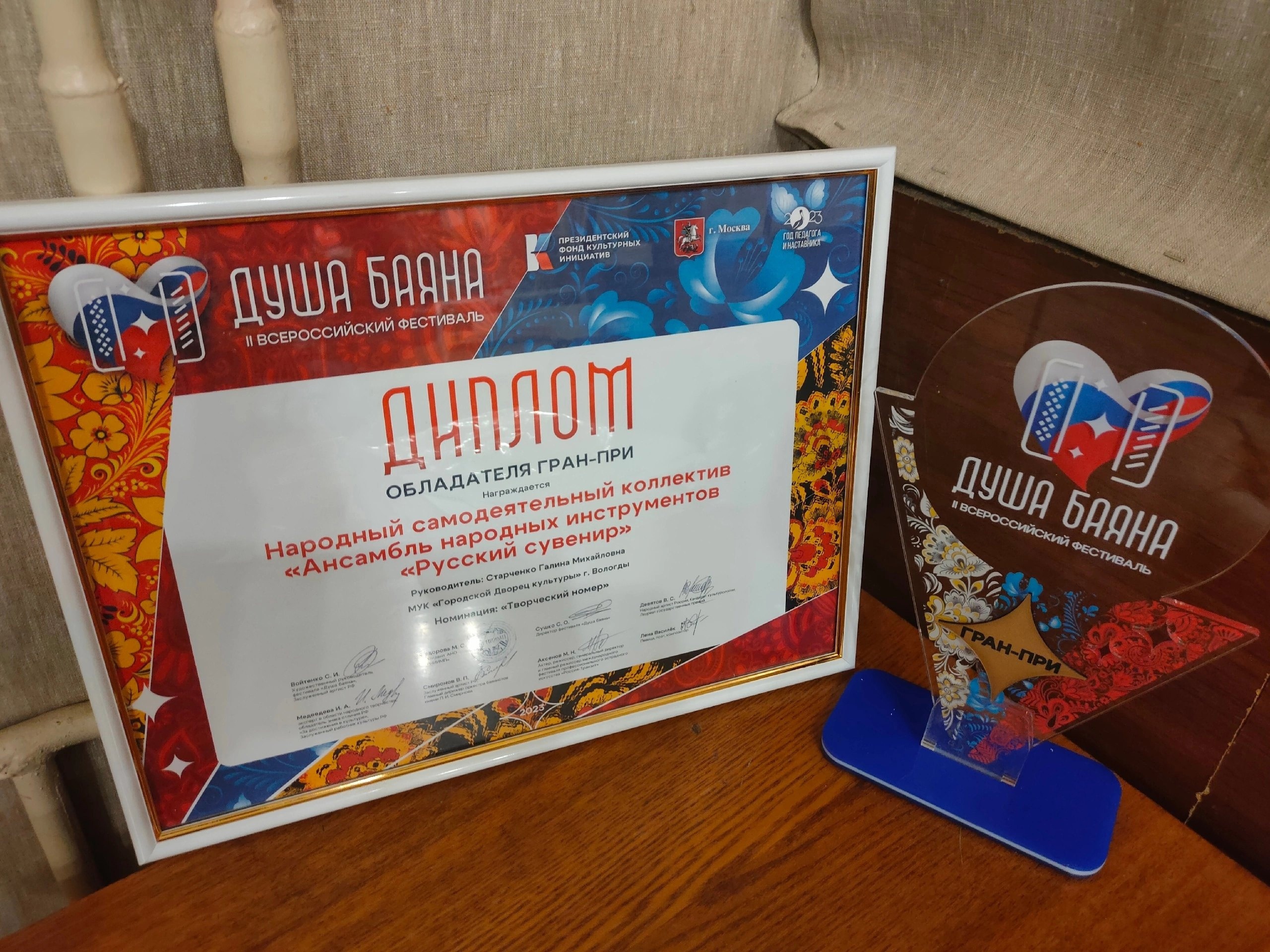 В ноябре 2023 года Ансамбль народных инструментов «Русский сувенир» Городского Дворца культуры завоевал Гран-при на Всероссийском фестивале «Душа баяна» и стал обладателем главного приза – сертификата на получение концертного баяна. А 27 июня уникальный инструмент, изготовленный по спецзаказу, был вручен руководителю народного самодеятельного коллектива «Ансамбль народных инструментов „Русский сувенир“», заслуженному работнику культуры Вологодской области Галине Старченко.