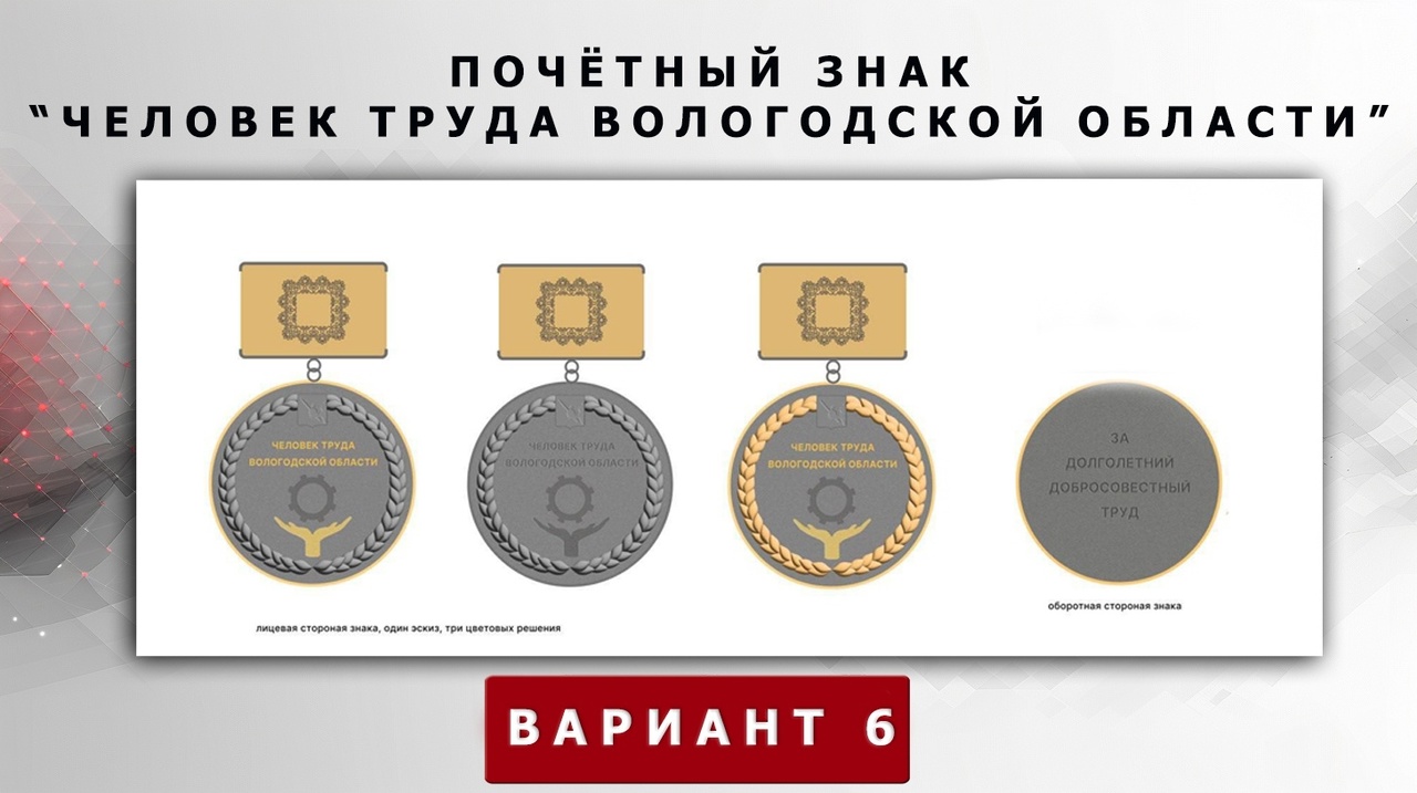 На голосовании представлено шесть вариантов эскизов почетного знака – проголосовать можно за один из них. Сделать это можно в официальном телеграм-канале врио Губернатора Вологодской области Георгия Филимонова: https://t.me/filimonov_official/9811, а также на его странице в социальной сети ВКонтакте: https://vk.com/wall832483485_73723.