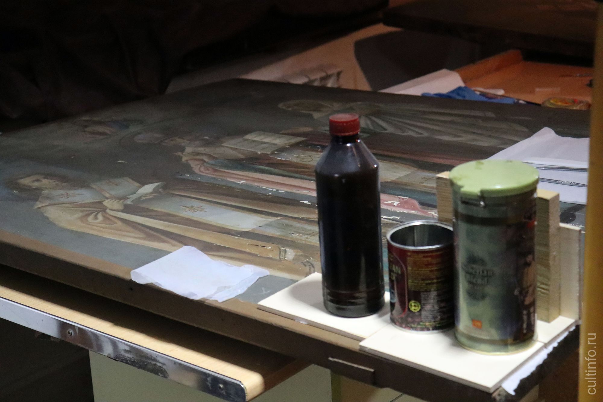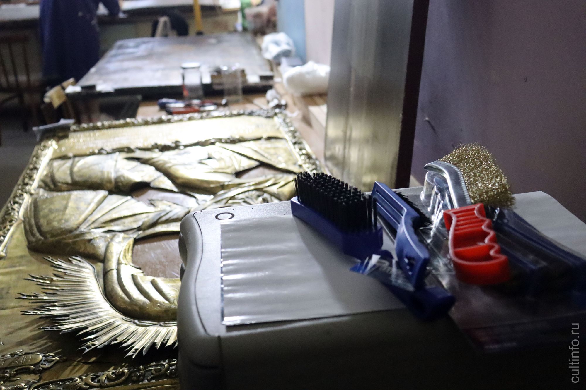 Параллельно ведется реставрация оклада. Его расчищают специальными составами, в местах разрыва будет применяться пайка.