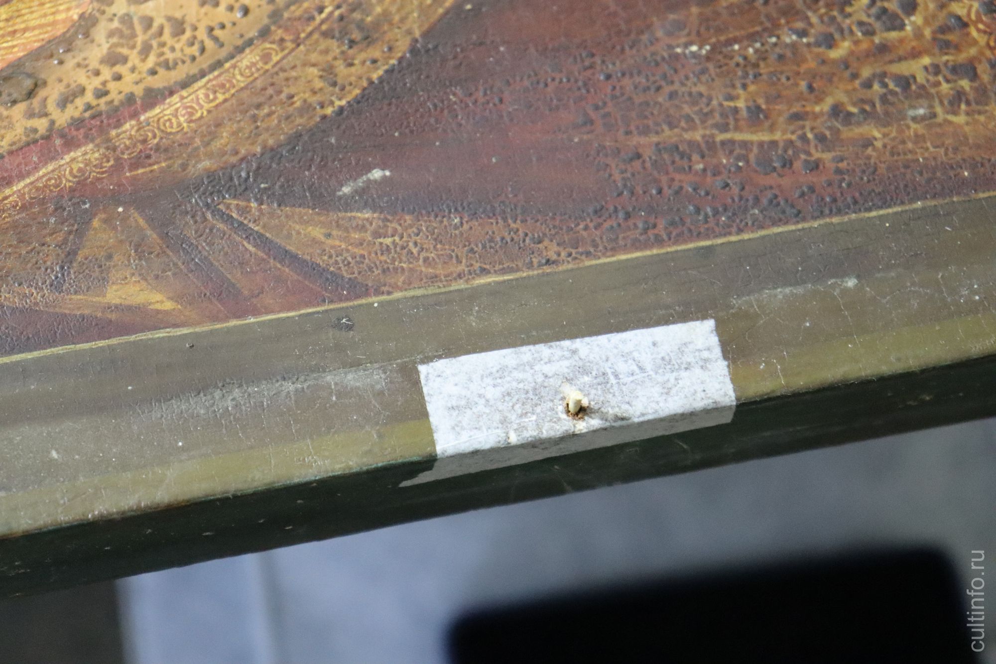 В укреплении нуждается и деревянная основа иконы. Она состоит из восьми досок. Восьмая доска начала расслаиваться. Специалист предполагает, что, возможно, на этот угол при хранении попадала вода. Добавил работы и точильщик, который проел не только доску, но и паволоку.
