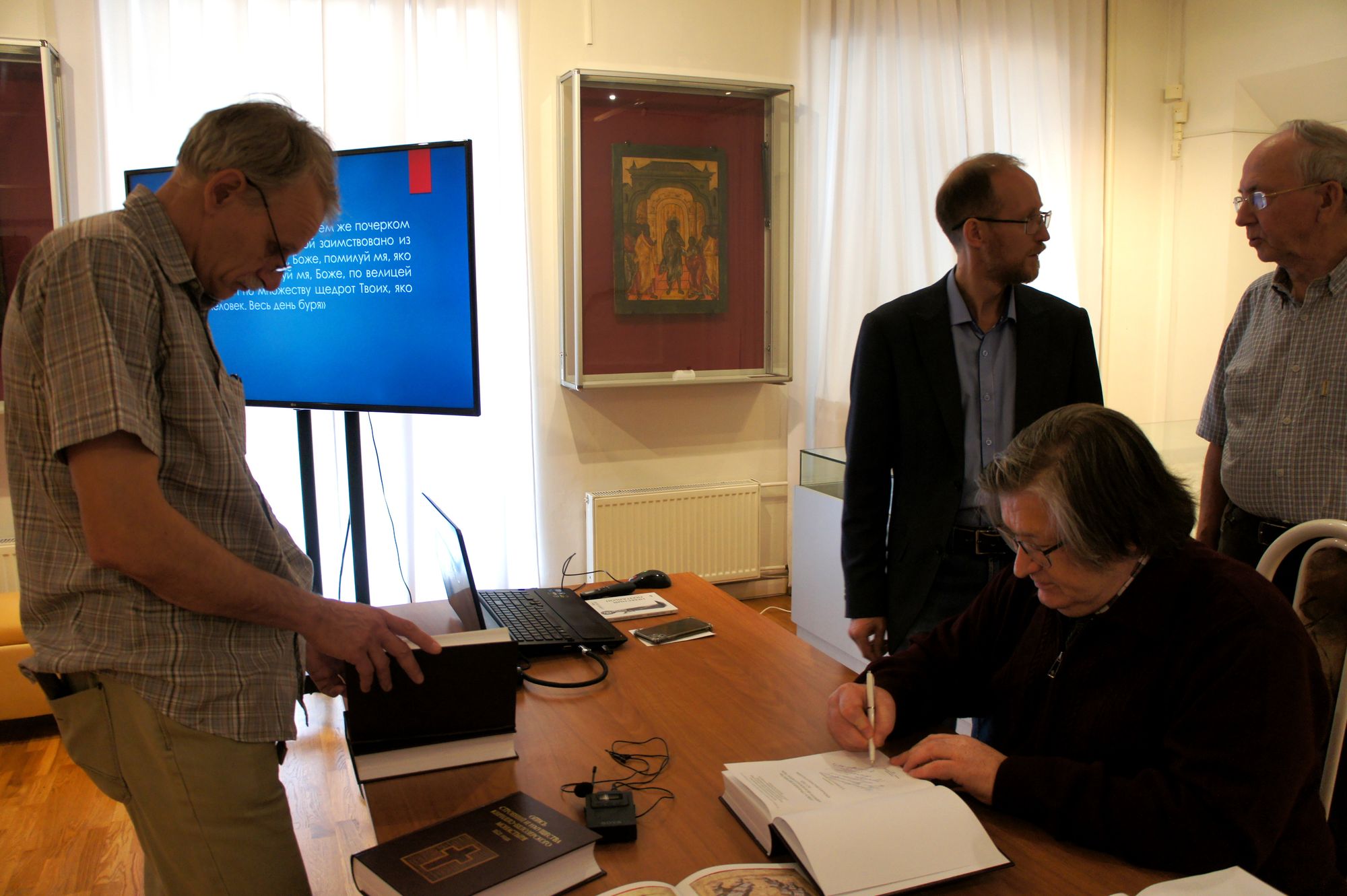 Михаил Шаромазов отметил: работа над изданием шла более пяти лет, в ней приняли участие 13 научных сотрудников, четыре институции – Санкт-Петербургский институт РАН, Российская национальная библиотека, Кирилло-Белозерский музей-заповедник, Санкт-Петербургская академия художеств имени Ильи Репина. Вдохновителем создания этой уникальнейшей книги стала доктор исторических наук Зоя Дмитриева, которая в прошлом году ушла из жизни. «В далеком 1995 году мы начинали с ней работу над описью 1601 года, которая открыла сотрудникам музея новые горизонты в изучении истории Кирилло-Белозерского монастыря. Затем при участии доктора исторических наук Викторовича Башнина были подготовлены описи 1615 и 1635 годов. Для нас было чрезвычайно важно рассматривать публикацию описей XVII века, как некий триптих, единое издание, где комментарии к описи 1668 года, над которой мы уже работаем, будут общими», – подчеркнул Михаил Шаромазов.
