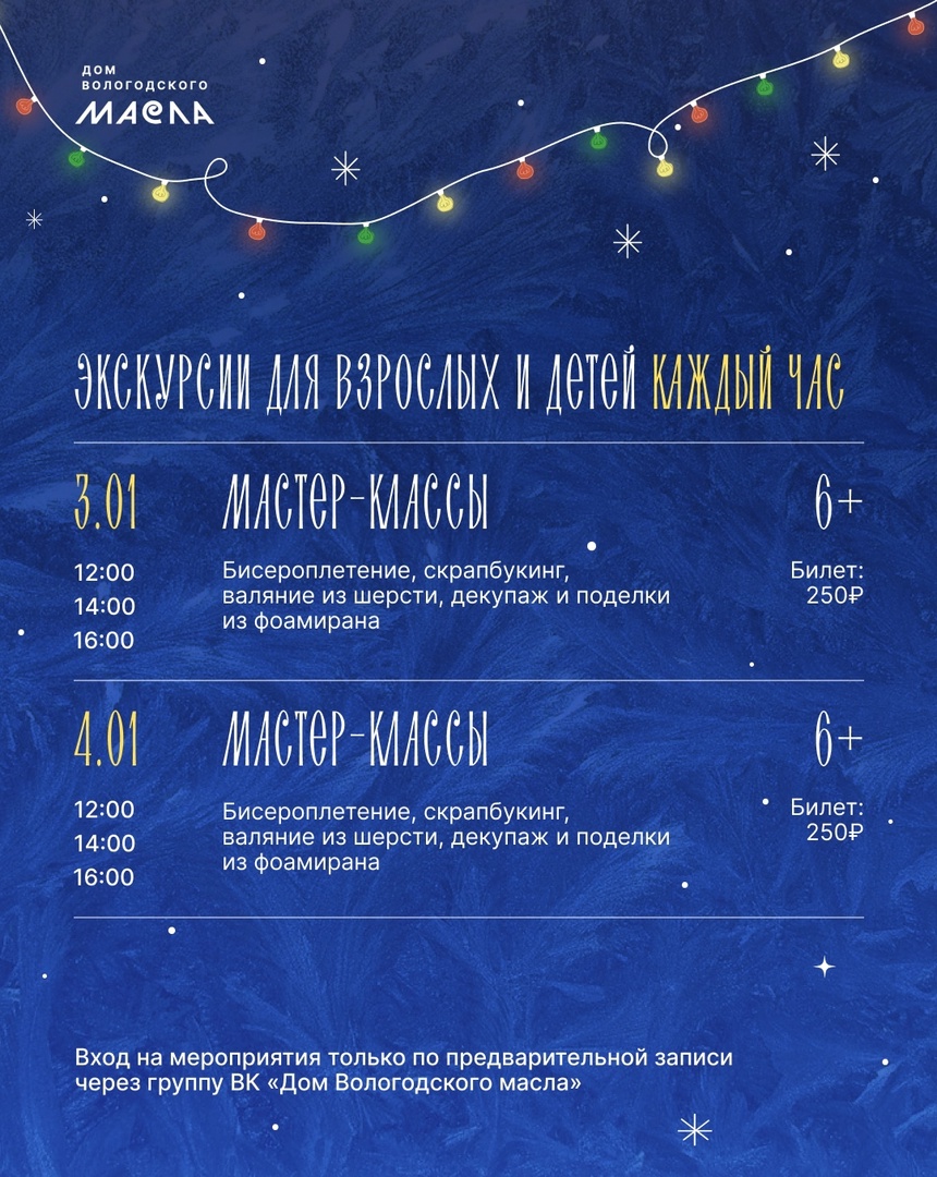 3 января в 12:00, 14:00 и 16:00 – новогодние мастер-классы для всей семьи: бисероплетение, скрапбукинг, валяние из шерсти, декупаж и поделки из фоамирана. Билет – 250 руб. 6+ Вход на мероприятия – только по предварительной записи в сообщениях группы vk.com/thebutterhouse, оплата билетов – перед мероприятием в кассе.