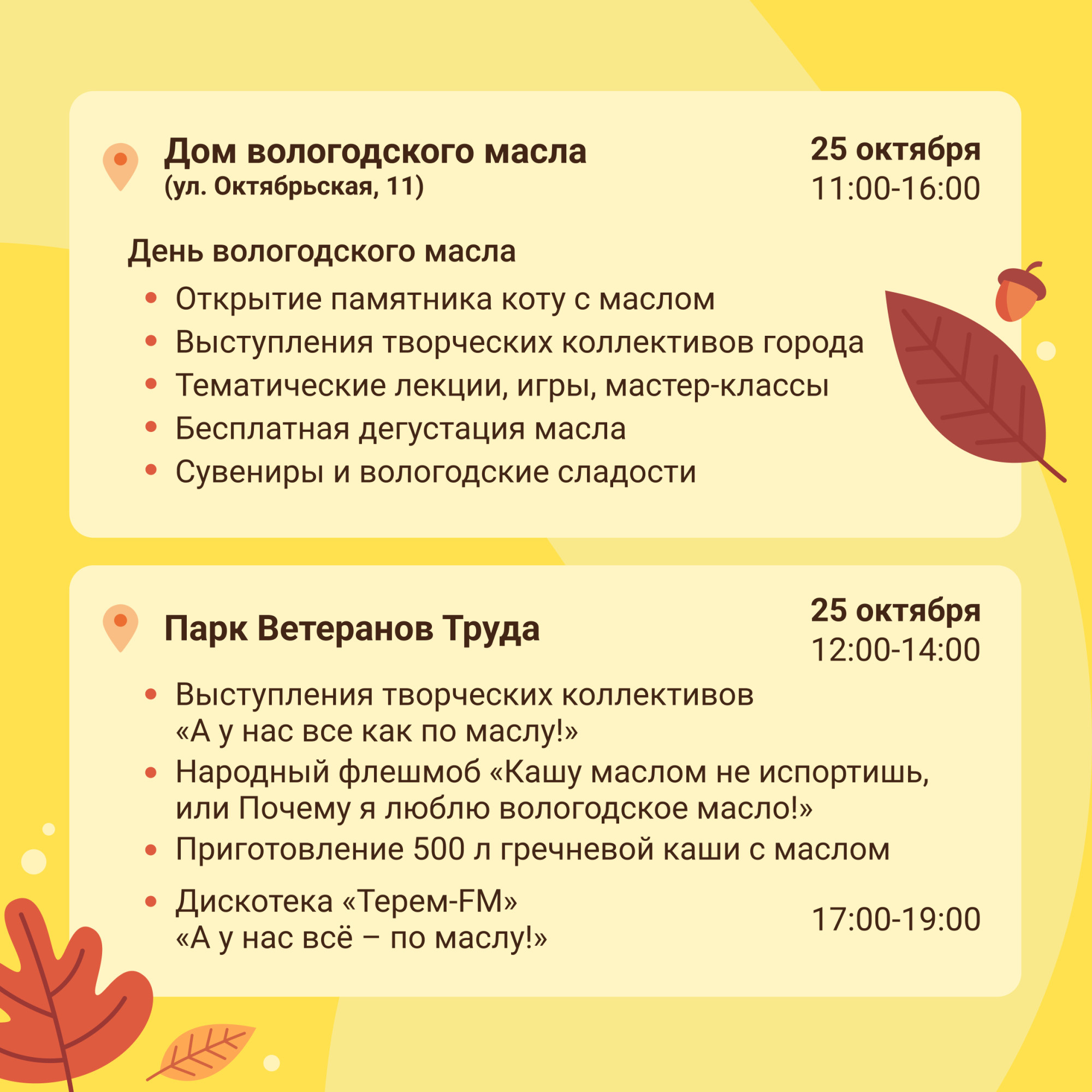 Главной площадкой празднования станет Дом вологодского масла, также мероприятия пройдут в парке «Евковка» и в Парке ветеранов. Запланированы выступления фольклорных коллективов, мастер-классы, дегустация и продажа масла и молочной продукции. Центральным событием праздника в Парке ветеранов станет приготовление 500 литров гречневой каши с вологодским маслом, которой, конечно, угостят вологжан. А на крыльце Дома масла в праздничный день появится бронзовая скульптура «Кот с маслом», которая станет еще одним символом гастрономического музея. Расписание событий смотрите на картинках: