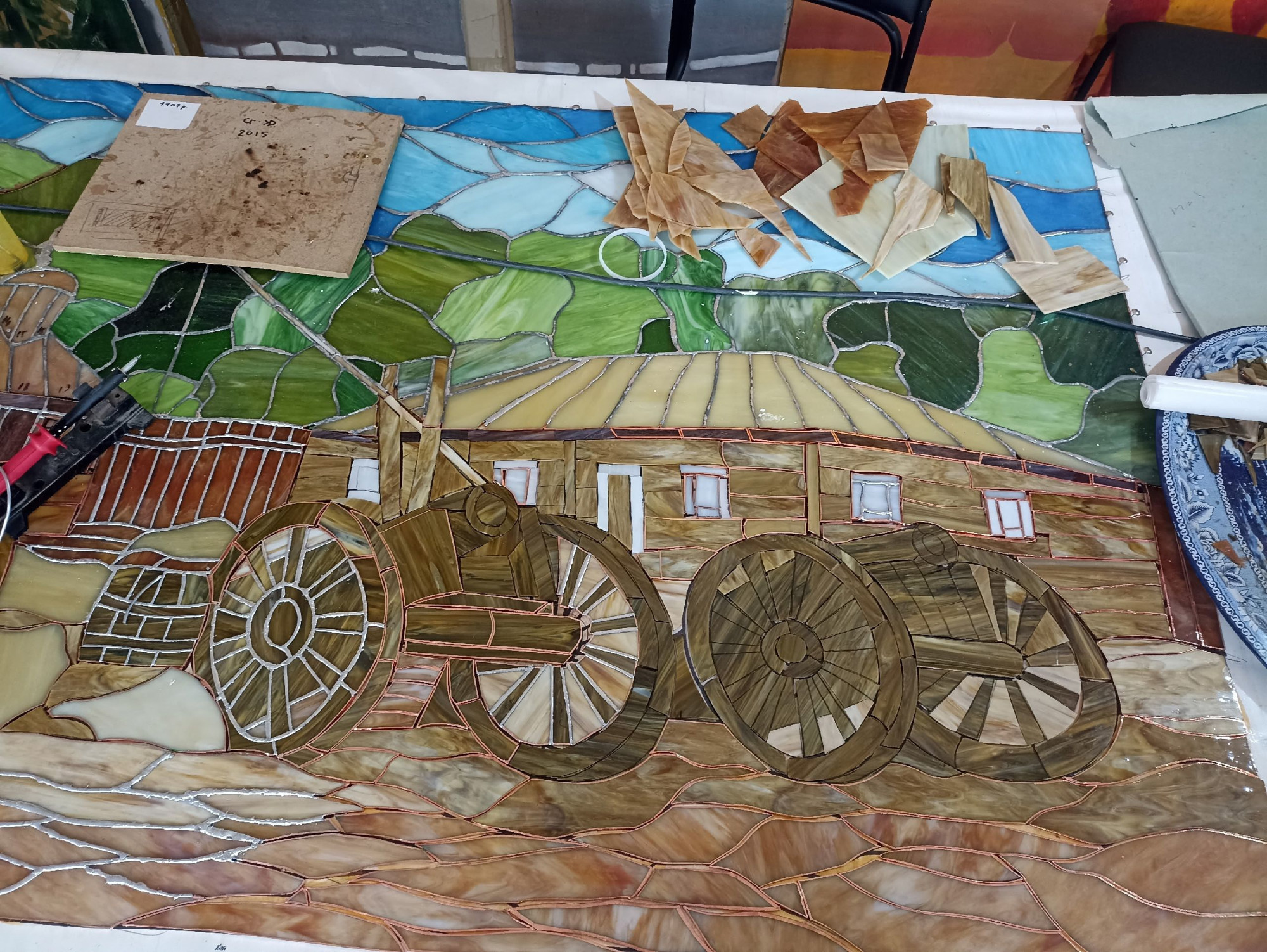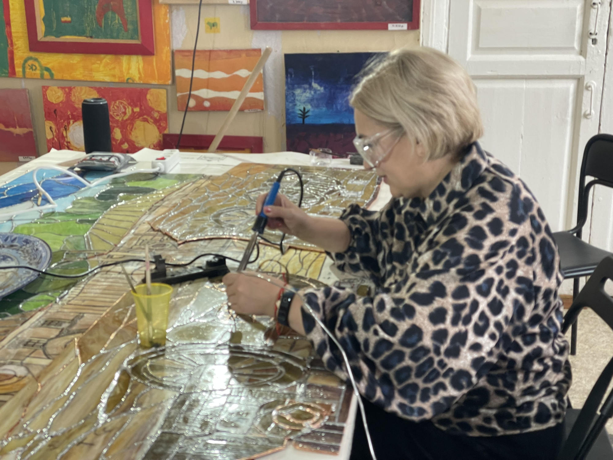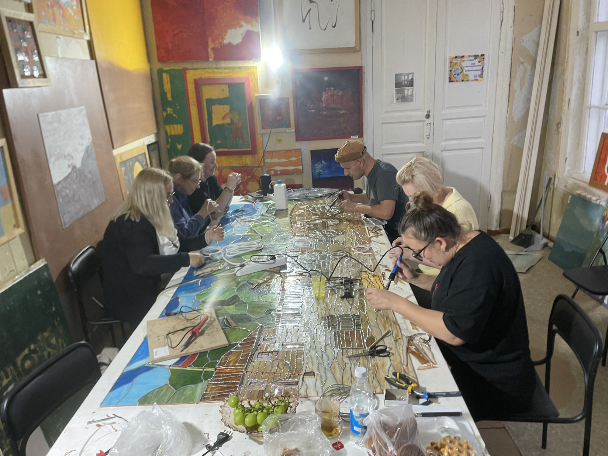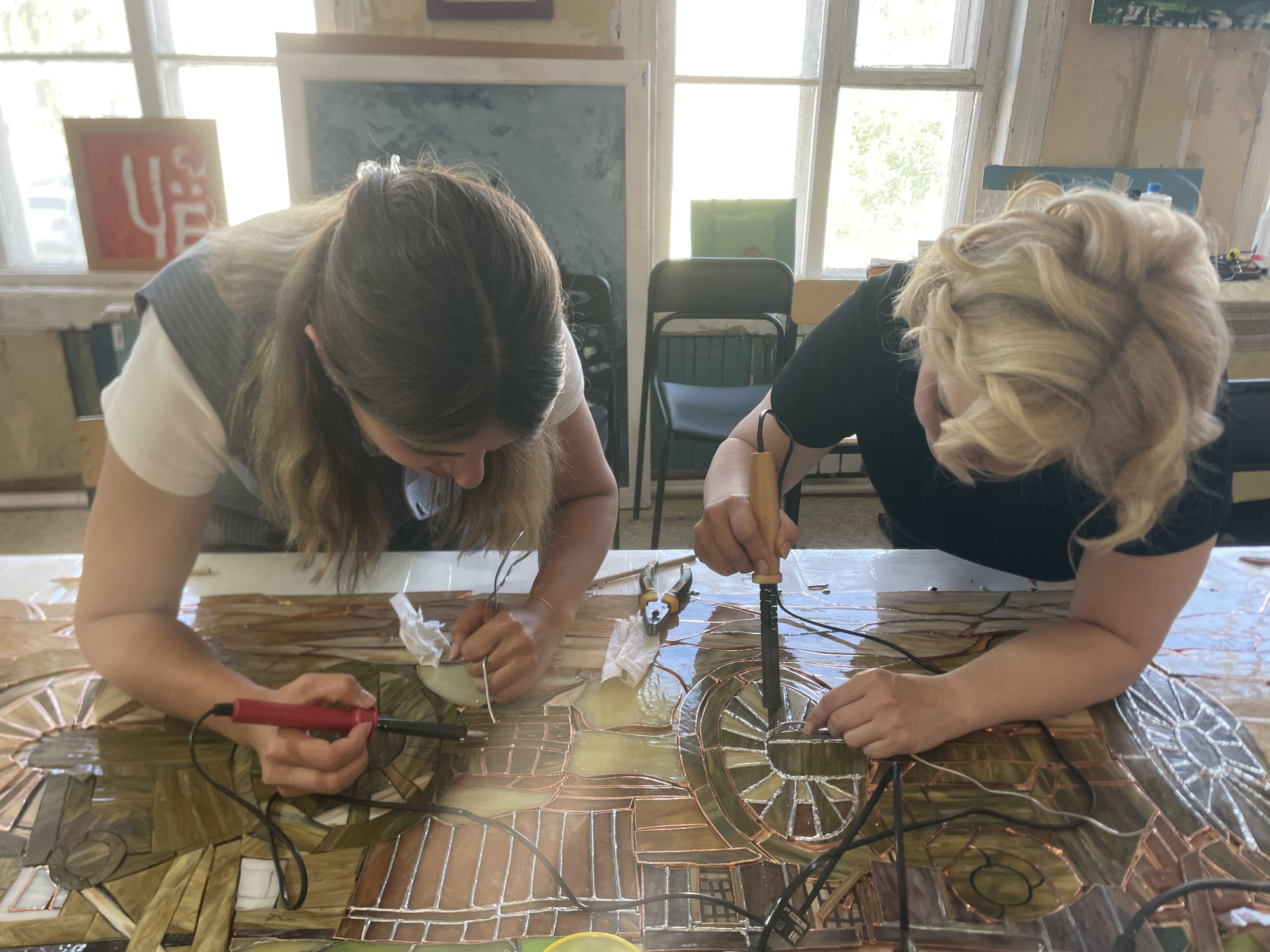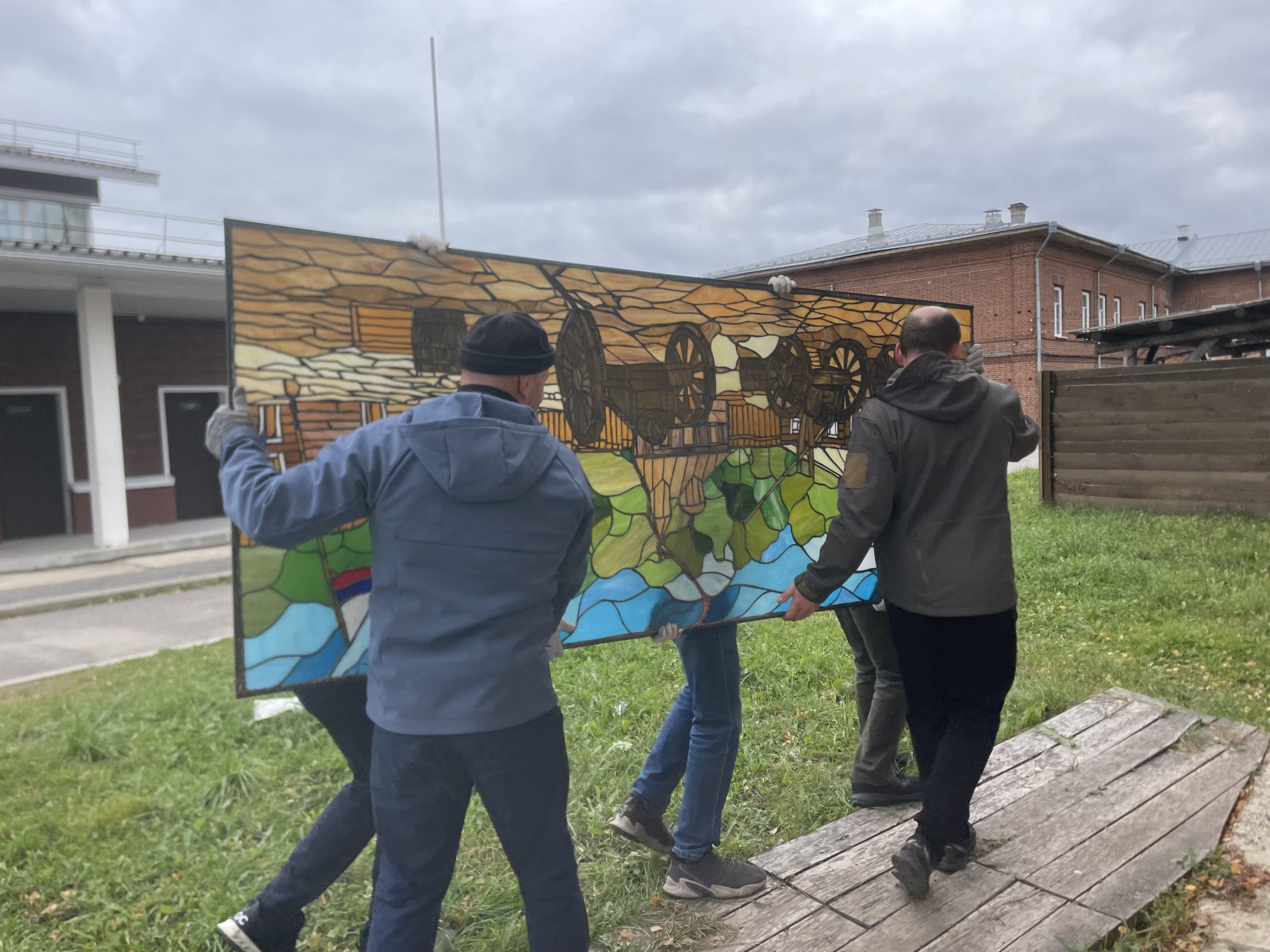 Мастерскую в Тотьме создали на базе общественного пространства «Городской сад», а для работы над витражом набрали более 50 волонтеров из Тотьмы и других городов, в том числе ребят с ОВЗ. Для них организовали занятия по изготовлению витражей. Кураторами мастерской выступили сотрудники Тотемского музейного объединения Светлана Немирова и Вера Галушкина. Мастер-класс для волонтеров провел руководитель проекта «Рубежи России», глава ремесленной мастерской «Верес» из Ивангорода Виктор Федосеев. Он же помог с финальными работами над витражом и его установкой.