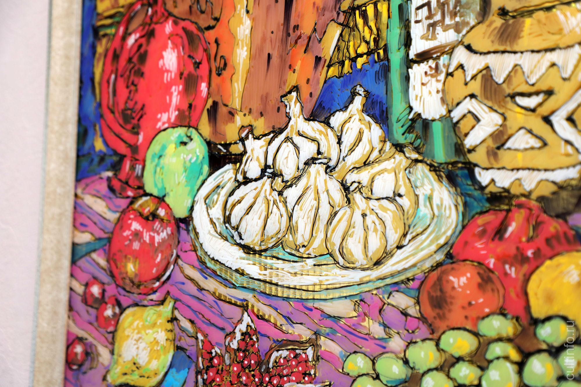 На картинах оживают звери и сказочные персонажи. Здесь можно увидеть тигра, жар-птицу и рыцаря, обнажившего меч. Аппетитные натюрморты создают атмосферу праздника и беззаботности.