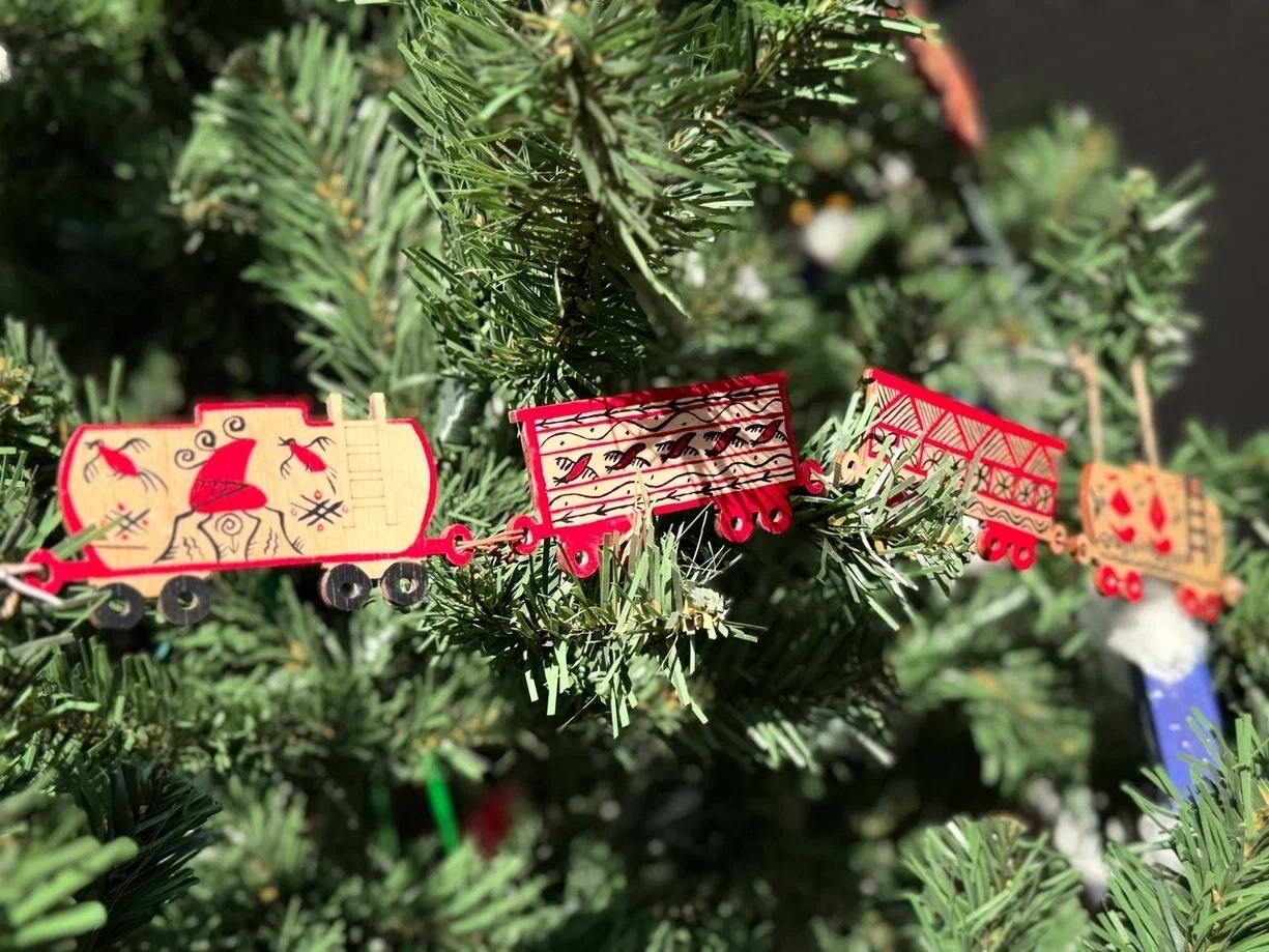 На ветвях главной елки вокзала разместились восемь расписанных вручную деревянных поездов из 150 вагонов и более 100 домиков, сообщает пресс-служба Северной железной дороги.