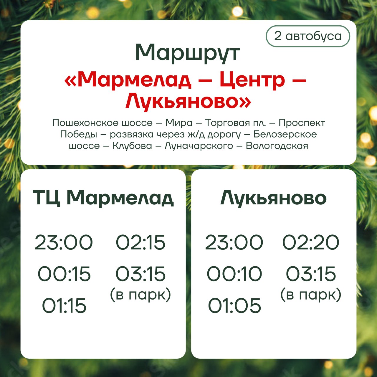 Чтобы жители могли добраться до праздничных локаций из разных микрорайонов Вологды, общественный транспорт будет работать с 00:30 до 03:00 1 января. Проезд в автобусах в новогоднюю ночь будет бесплатным. На пять маршрутов будет выведено восемь машин.