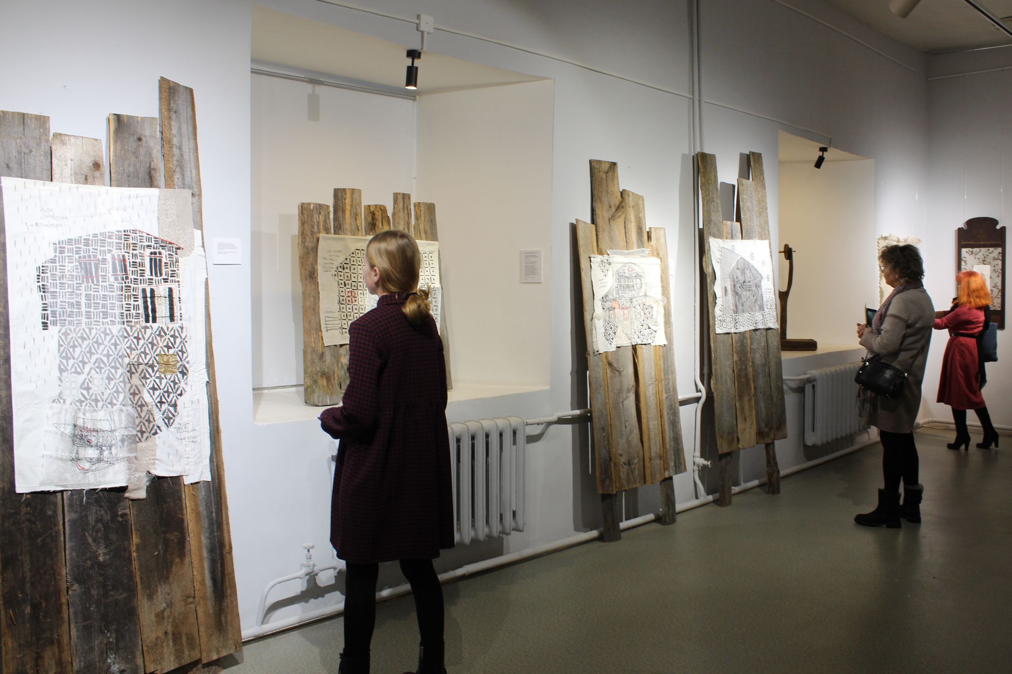 Неведомую грусть, тоску по разрушающимся деревням Агния обратила в текстильные панно, которые напоминают аппликации. Дополняют экспозицию старинные платки с вышитыми уютными сюжетами деревенского чаепития.