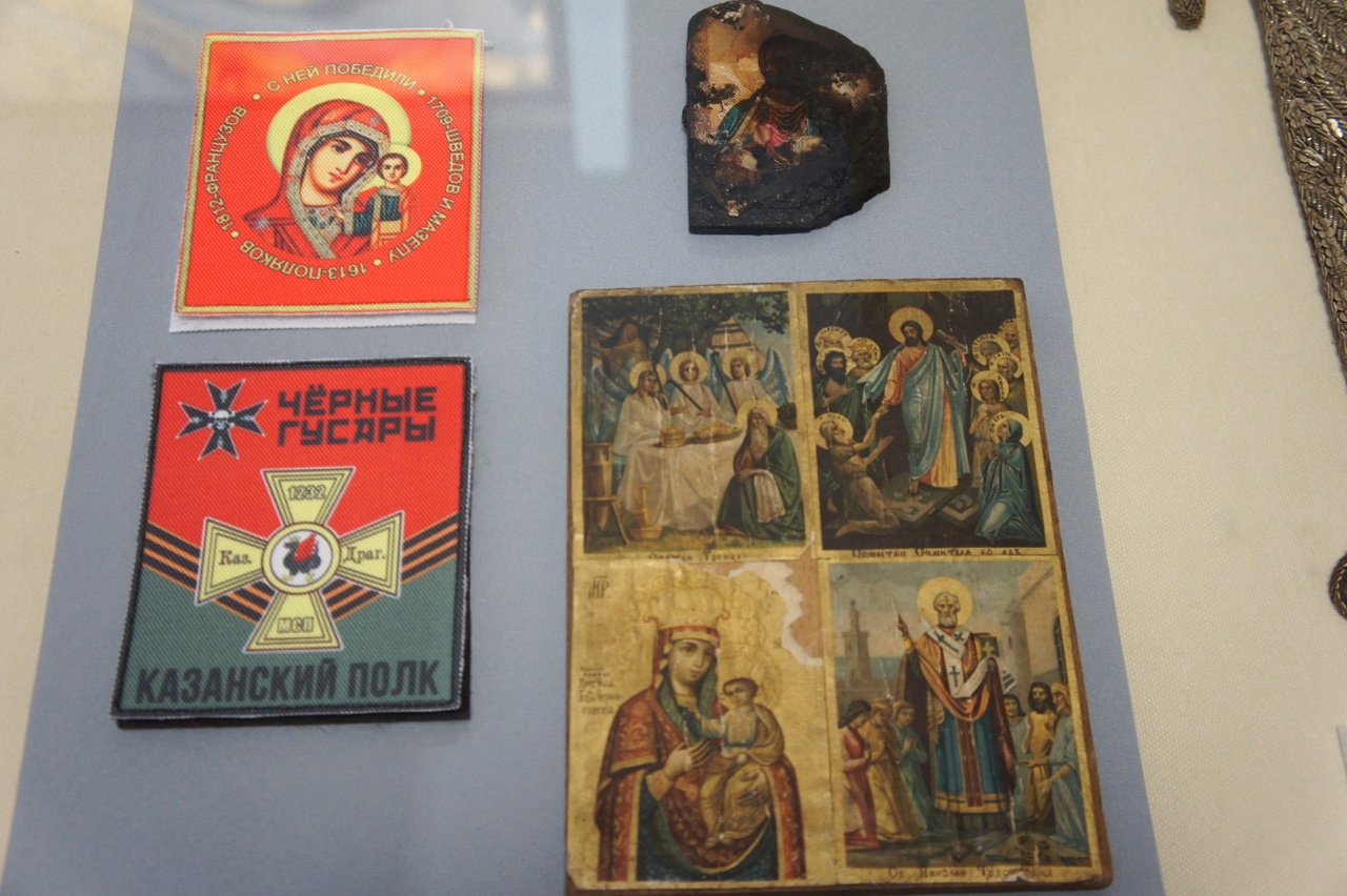 Экспозиция, где находятся образы, оберегавшие русских воинов в бою, посвящена 80-летию Победы в Великой Отечественной войне и участникам специальной военной операции.