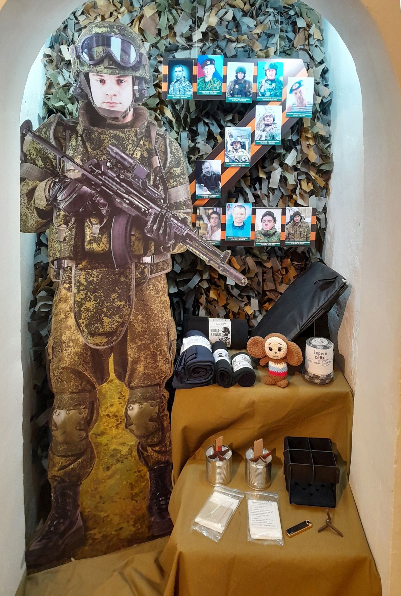 Второй раздел экспозиции посвящен наследникам Великой Победы. Посетители выставки смогут увидеть семейные реликвии (личные вещи, документы, награды) участников войны в Афганистане, операции по восстановлению конституционного порядка в Чечне, фотографии устюжан, погибших в зоне специальной военной операции. Здесь же демонстрируются и образцы изделий, выполненных руками устюжан в 2023–2025 годах в помощь участникам СВО: маскировочная сеть, окопные свечи, разборная печь-щепочница, пятиточечник и др.