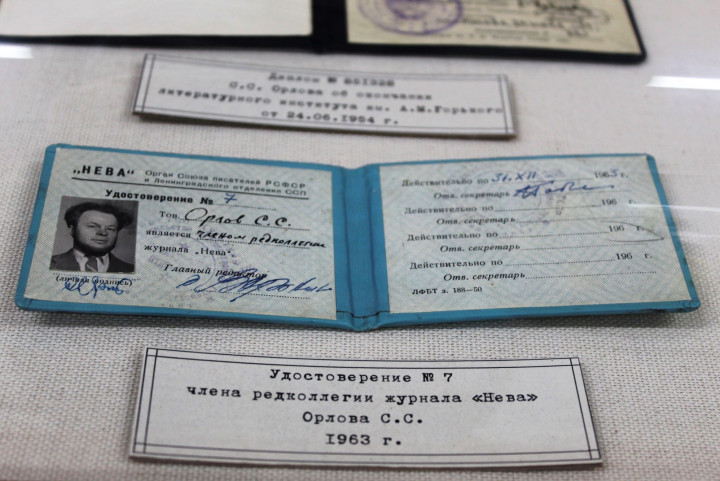 На выставке представлены архивные документы, фотографии и личные вещи Сергея Орлова из фондов Белозерского областного краеведческого музея.