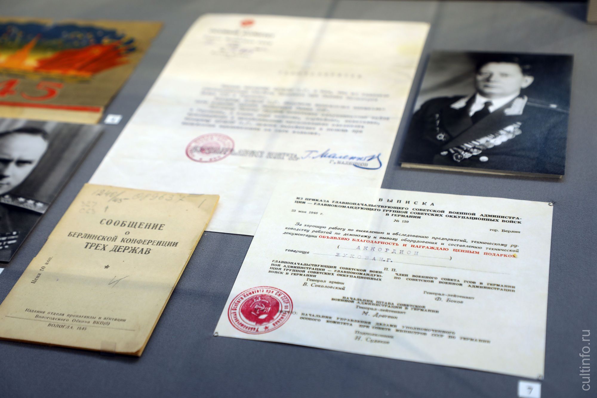 Экспозиция также рассказывает о подведении итогов войны: демилитаризации Германии, разделу ее и Берлина на оккупационные зоны, выплате репараций. «Мы показываем фотографии встречи советских и американских войск в Торгау, на берегах Эльбы, и называем людей, которые работали с Берлином после войны. Например, представлены документы генерал-майора технических войск Николая Шухова. Из них следует, что он являлся представителем особого комитета Совета министров по техническому оснащению и изучению тех промышленных предприятий, которые вывозились с территории Германии в Советский Союз в качестве репараций. В общей сложности до 1948 года в Советский Союз было вывезено 37 промышленных предприятий, что составило немногим более 4,5% тех потерь, которые понесла страна в годы Великой Отечественной войны», – отметила Галина Козина.