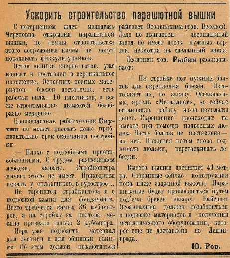 Открытие парашютной вышки в Череповце состоялось 25 июля 1937 года. Газета «Коммунист» так описывала события этого дня: «…Первыми совершили прыжки монтажники вышки и работники райсовета Осоавиахима. Нашлось немало желающих прыгнуть с парашютом и из публики. Прыгают учащиеся Куровская Н., Глызина О., Коквин В. и др.