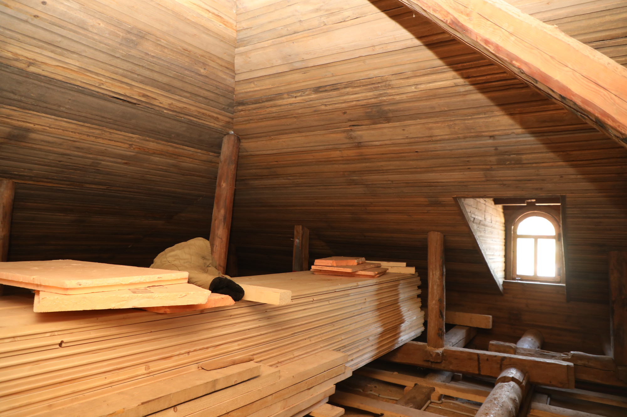 А в пристройке приспосабливают подкровельное пространство под музей дома Засецких. Реставраторы предполагают, что эта часть здания сделана из бревен разобранного в начале ХХ века флигеля. И это не единственное повторное использование материалов на доме. Тот же тес применялся и как обрешетка, им выравнивали стены, подшивали карнизы. В будущем музее тесовой доской XIX века обшиты скаты кровли. Используют тес и как выставочный образец, демонстрирующий, как раньше делали кровли.