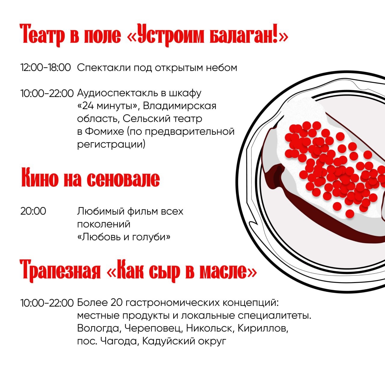 Также в программе – дегустации, ярмарка-продажа, ремесленные мастер-классы, народные игры, детские активности и показ любимого многими фильма «Любовь и голуби». А еще состоятся события фестиваля «Вологда.Фолк».