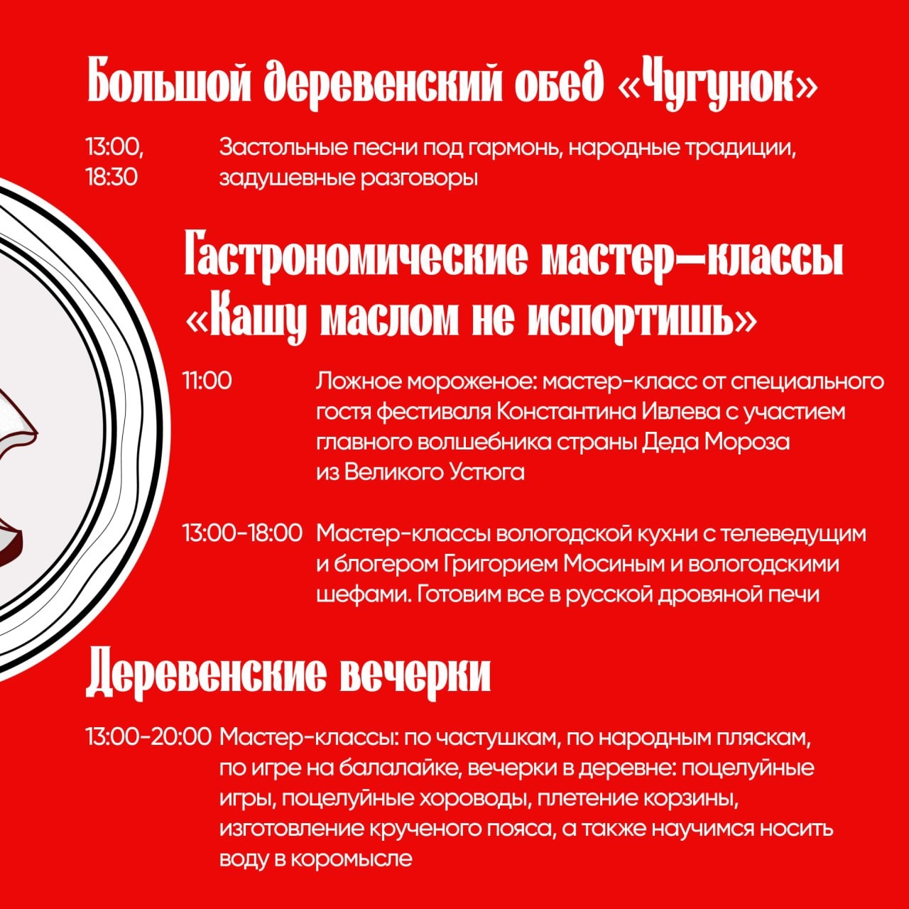 Все желающие смогут принять участие в большом деревенском обеде «Чугунок». Будет работать большая ресторанная зона с местными блюдами и продуктами вологодских производителей.