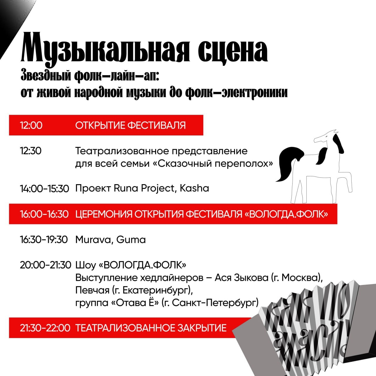 20:00-21:30 Шоу «Вологда.Фолк». Выступления: Ася Зыкова (Москва), Певчая (Екатеринбург), группа «Отава Ё» (Санкт-Петербург). 12+