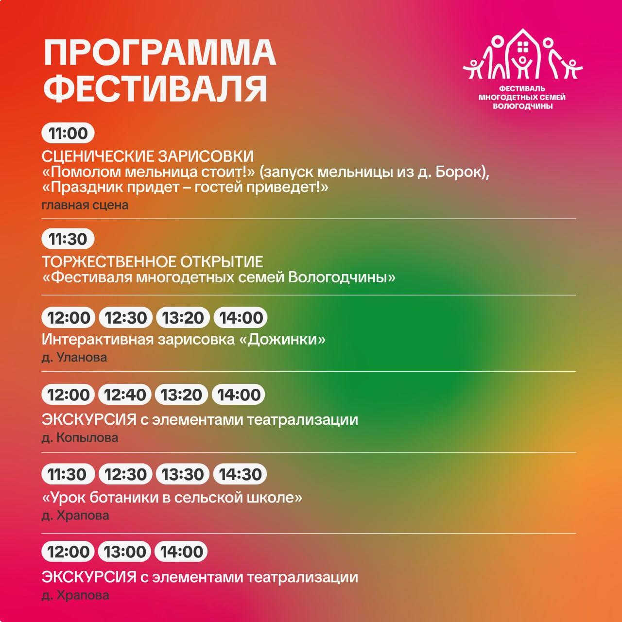 «Проведем фестиваль в знак благодарности семьям, которые своим трудом и заботой создают прочный фундамент будущего региона. Готовим насыщенную праздничную программу в духе русской деревни, народных традиций, урожайного сезона. Приглашаем всех жителей и гостей Вологодчины от мала до велика. Для дошкольников, детей из многодетных семей, инвалидов, военнослужащих срочной службы участие бесплатное», – рассказал Георгий Филимонов.