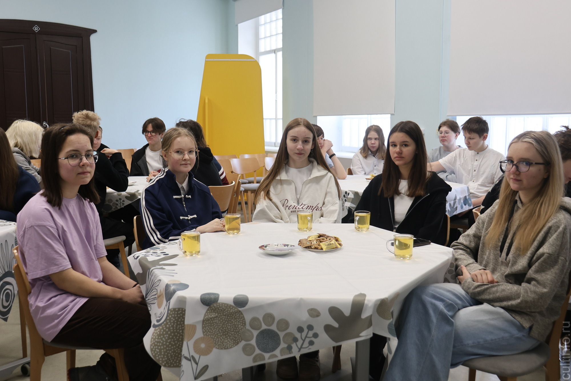 Рассказ продолжился уже в здании библиотеки, где ребята попробовали необычное угощение – сахарные сушки и морковный чай, который любил поэт. За самоваром школьники узнали и о других гастрономических пристрастиях Есенина, например, о том, что из супов он предпочитал борщ. Также ребятам рассказали историю храма святых Кирика и Иулитты, где венчался поэт, и о его потомках.