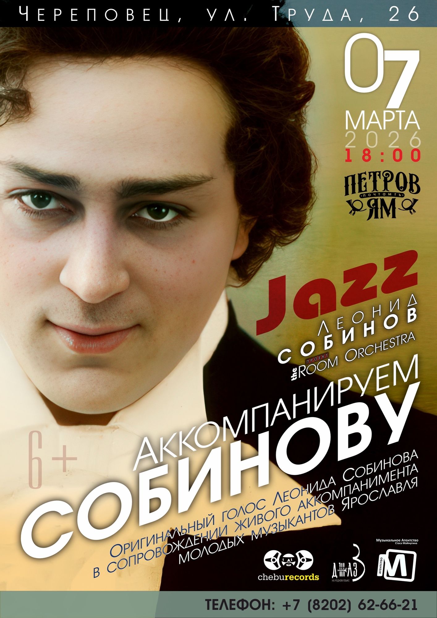 В арт-пространстве «Петров Ям» 7 марта состоится концерт необычного проекта «Аккомпанируем Леониду Собинову», который объединяет музыку разных столетий. Классические оперные арии, исполненные настоящим голосом Леонида Собинова, прозвучат под джазовый аккомпанемент молодых, но уже хорошо известных музыкантов из Ярославля Алексея Крутикова и Стаса Майнугина. Начало в 18:00 (Череповец, ул. Труда, 26).