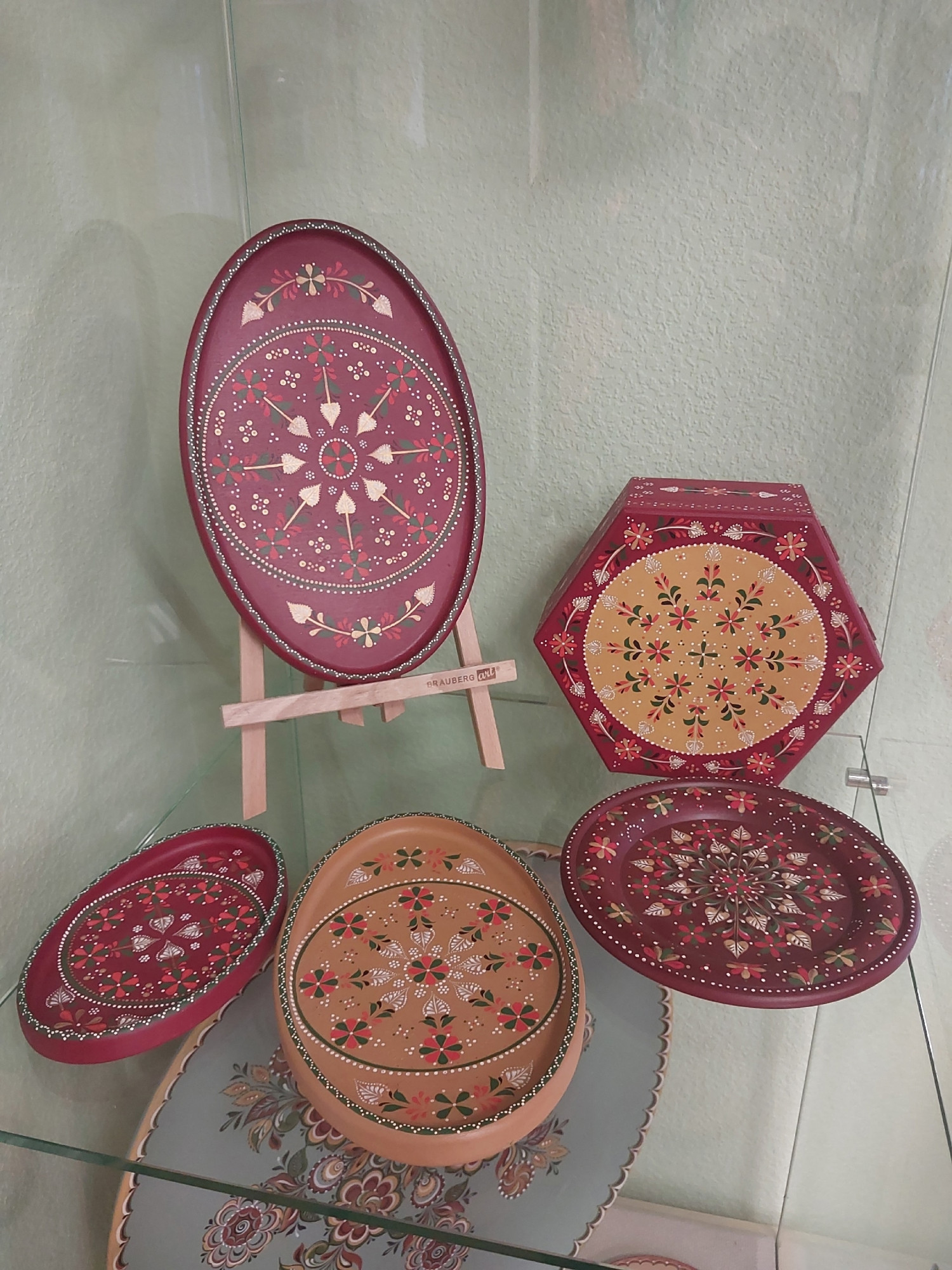 – расписные короба, тарелки и музыкальные инструменты юных мастеров из объединения «Художественная роспись» Дома детского творчества п. Тоншалово (педагог – Екатерина Гусева);